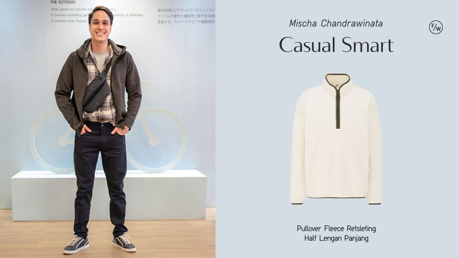 Casual smart merupakan ciri khas dari tampilan Mischa di berbagai kesempatan. Aktor bertubuh atletis ini, memfavoritkan Pullover Fleece Retsleting Half Lengan Panjang berwarna putih dengan detail line bernuansa coklat. Selain memancarkan kesan semi-formal dan sporty, jaket ini juga tampak ideal jika dipadukan bersama kemeja lengan panjang.