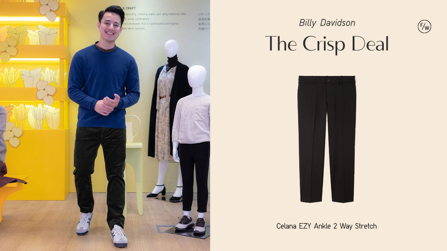Selalu tampak percaya diri dengan gaya preppy, Billy Davidson terpikat dengan item formal dari UNIQLO yaitu Celana EZY ANKLE 2 Way Stretch berwarna hitam yang juga datang dengan berbagai pilihan warna, yang sekarang ini sudah dapat dimiliki. Celana ini didesain untuk penyuka gaya neat dan clean. Kenyamanan menjadi highlight dari celana ini lewat pembaharuan berupa two-way stretch fabric yang memudahkan gerakan vertikal terjadi, hingga mengangkat dan menurunkan kaki.