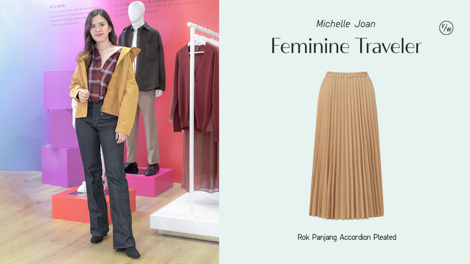Traveling menjadi kegiatan favorit Michelle Joan dengan berkarakter feminim yang alami dan berkulit cerah. Fun dan senang mempelajari budaya lain memberikan ketertarikan pada pakaian yang artistik. Tidak heran Rok panjang accordion pleated menjadi item koleksi LifeWear Fall-Winter 2020 pilihannya.