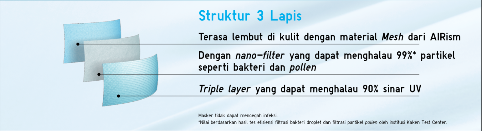 AIRism Mask mempunyai struktur tiga lapis yang dapat meningkatkan kinerja penyaringan. Pada bagian tengah masker terdapat filter dengan tingkat efisiensi penyaringan bakteri sebesar 99% yang mampu menghalangi masuknya percikan air dan melindungi kulit dari bakteri, partikel yang terkontaminasi virus dan serbuk sari (1). Filter tersebut kemudian dibalut dengan kain jaring berteknologi AIRism. Tak hanya itu, struktur tiga lapis AIRism Mask juga memiliki peringkat UPF 40, sehingga menghalangi 90 persen sinar ultraviolet.