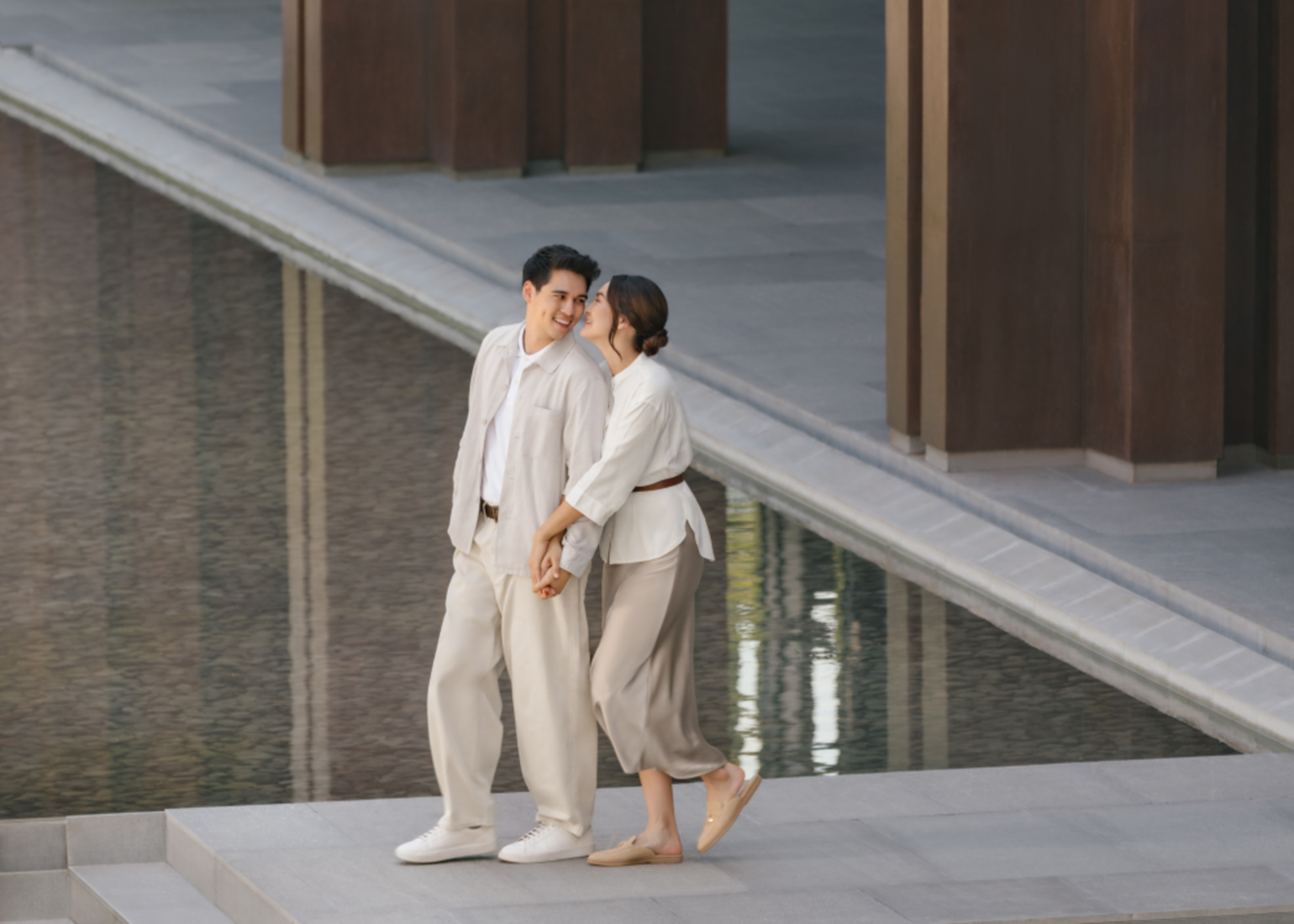 Dalam foto pre-wedding mereka, Luna dan Maxime tampil harmonis mengenakan koleksi Linen yang effortlessly chic. Pada foto pertama, keduanya memancarkan aura segar dalam pilihan outfit linen berwarna cerah. Maxime mengenakan Kemeja Premium Linen Lengan Panjang sebagai luaran yang dipadukan dengan Celana Rileks Linen Blend.