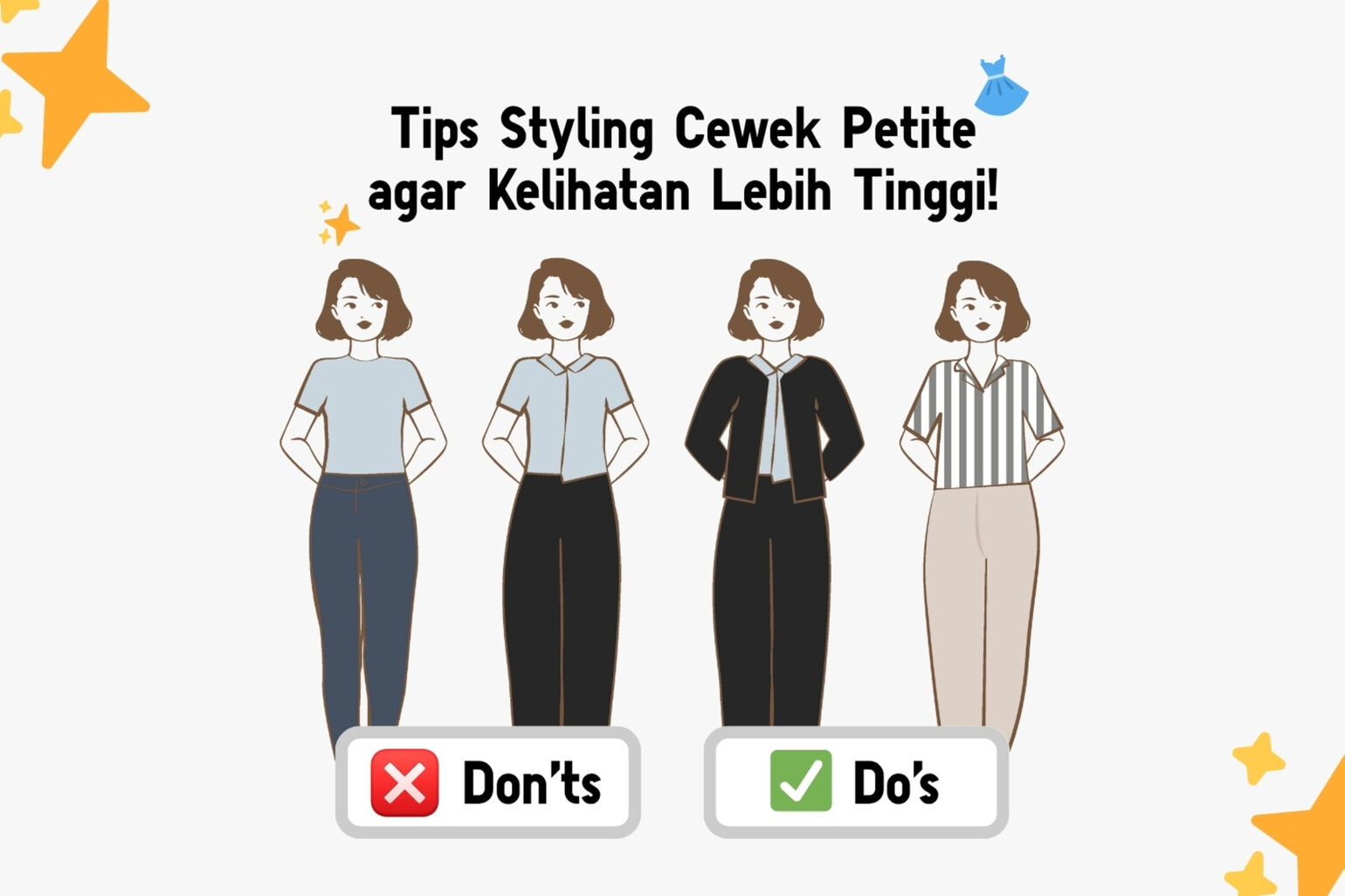 Bawahan yang paling pas untuk bentuk badan petite adalah celana high-waist. Mengapa? Karena fit-nya berada tepat di pinggang, model celana ini bisa menciptakan ilusi garis pinggang yang lebih tinggi. Hasilnya, kakimu jadi terlihat lebih jenjang. Sebaliknya, model celana low-rise atau mid-waist yang berada di bawah pinggang justru akan menambah volume pada bagian kaki, sehingga memberikan kesan “tenggelam” untuk tinggi badan kurang dari 160 cm.