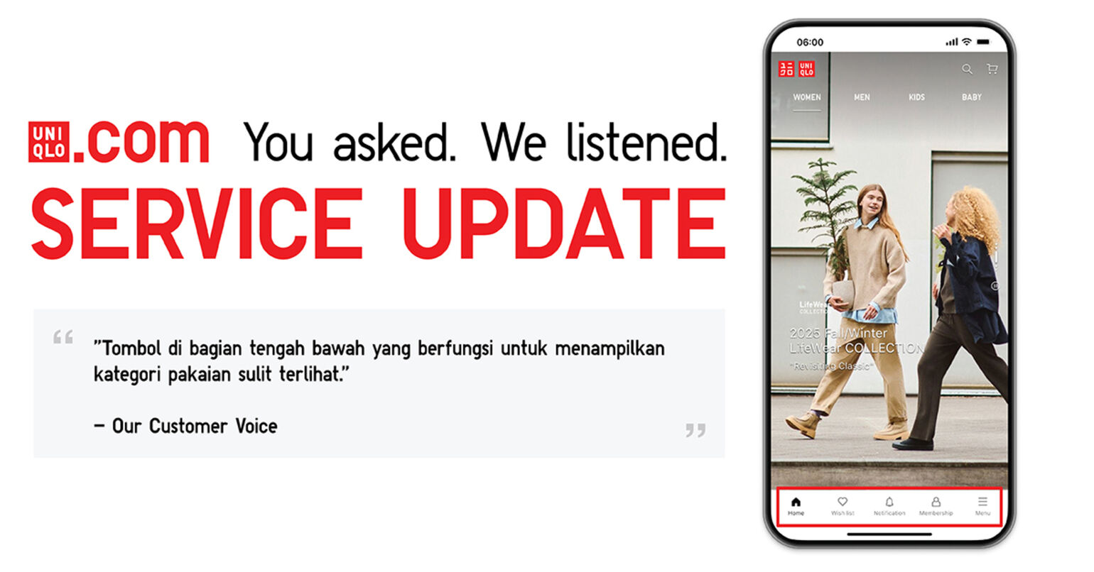 Sementara aplikasi mobile UNIQLO diperbarui dengan fitur riwayat pesanan digital, konten pilihan, dan layanan pelanggan yang lebih optimal, sehingga pelanggan dapat merasakan pengalaman berbelanja yang lebih terintegrasi, nyaman, dan personal.