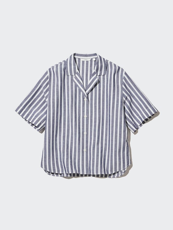 Linen Blend Striped Open Collar Short Sleeve Shirt