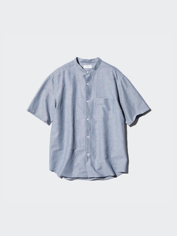 Cotton Linen Stand Collar Shirt | Short Sleeve Stripe