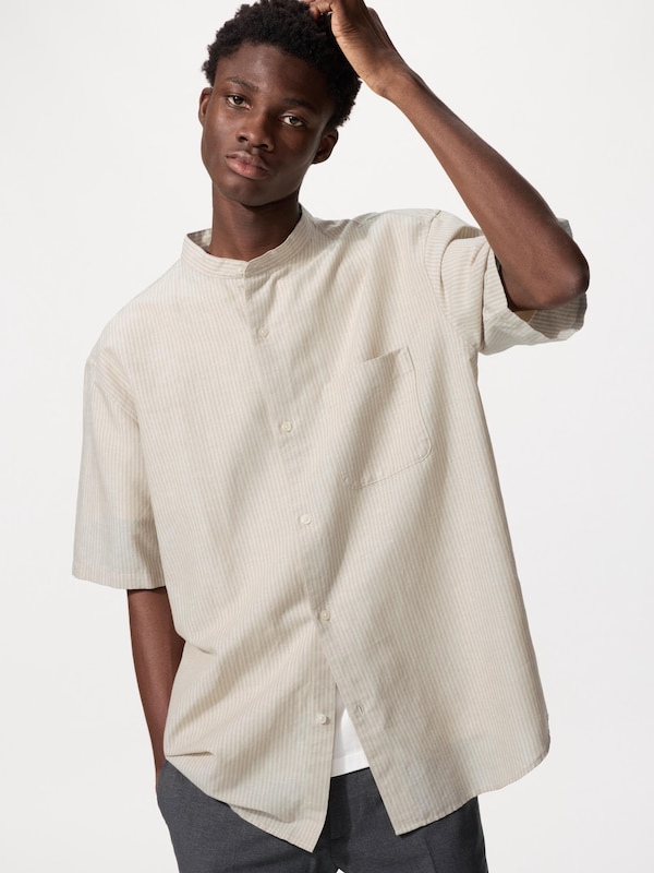 Cotton Linen Stand Collar Stripe Shirt | Short Sleeve