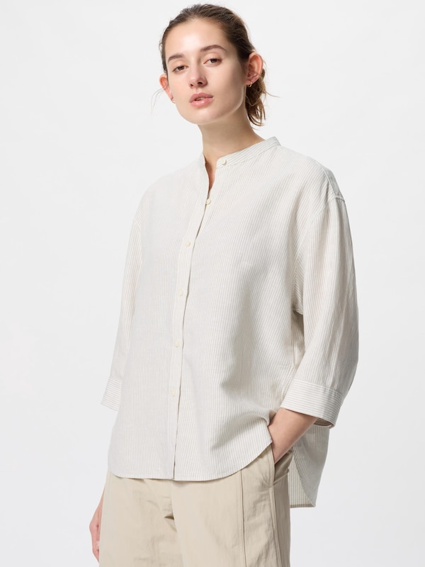 Kemeja Linen Blend Kerah Tegak 3/4 | Garis