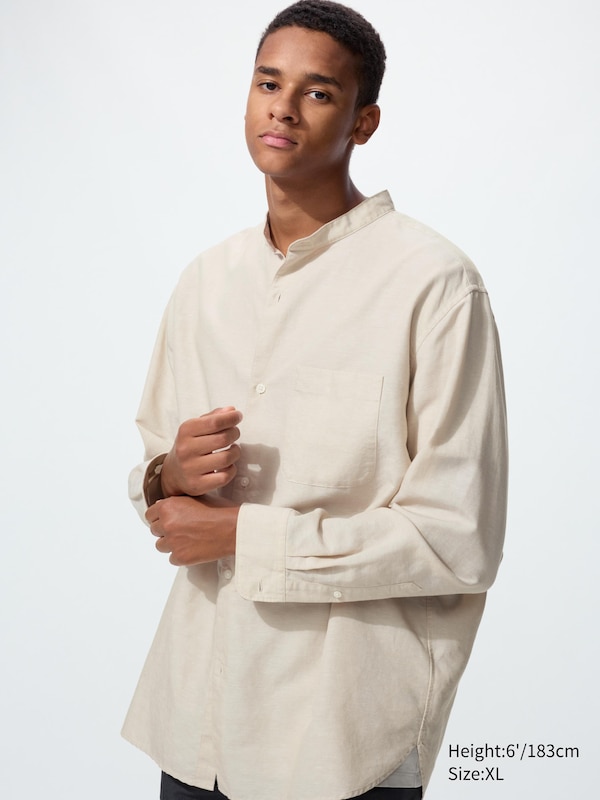Kemeja Katun Linen Kerah Tegak Lengan Panjang
