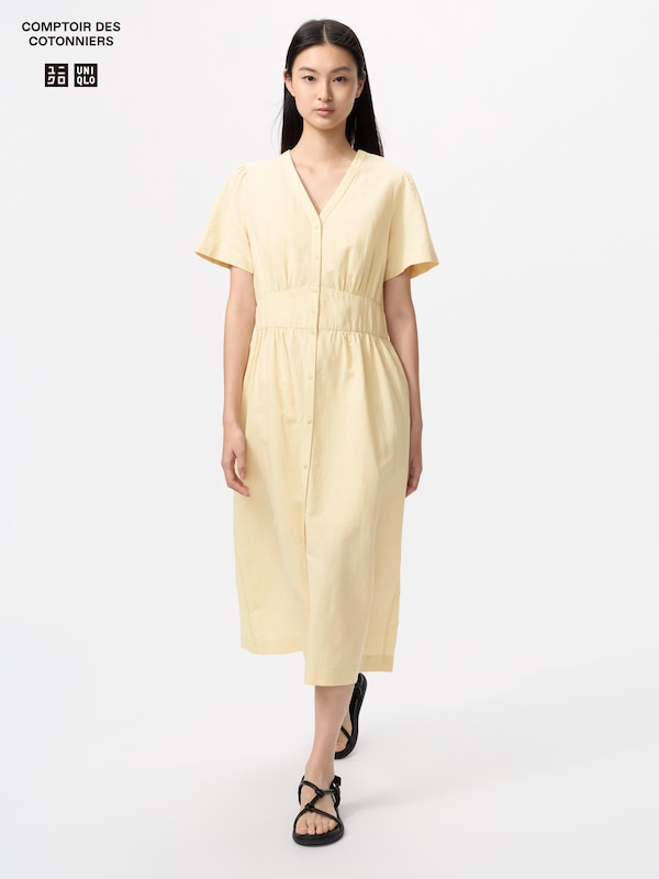 Linen Blend V Neck Dress Short Sleeve