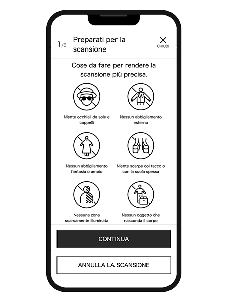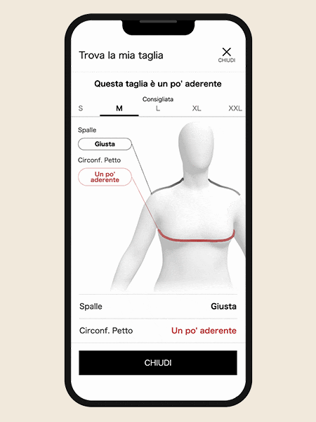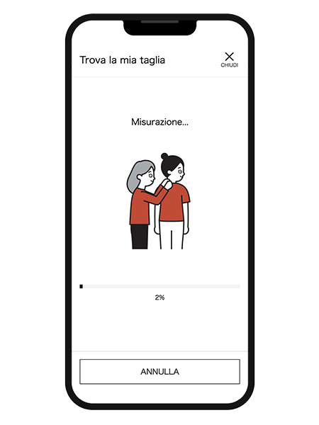 Un algoritmo valuta le proporzioni del corpo e suggerisce una taglia in base alle misure acquisite e alla vestibilità indicata come preferita.