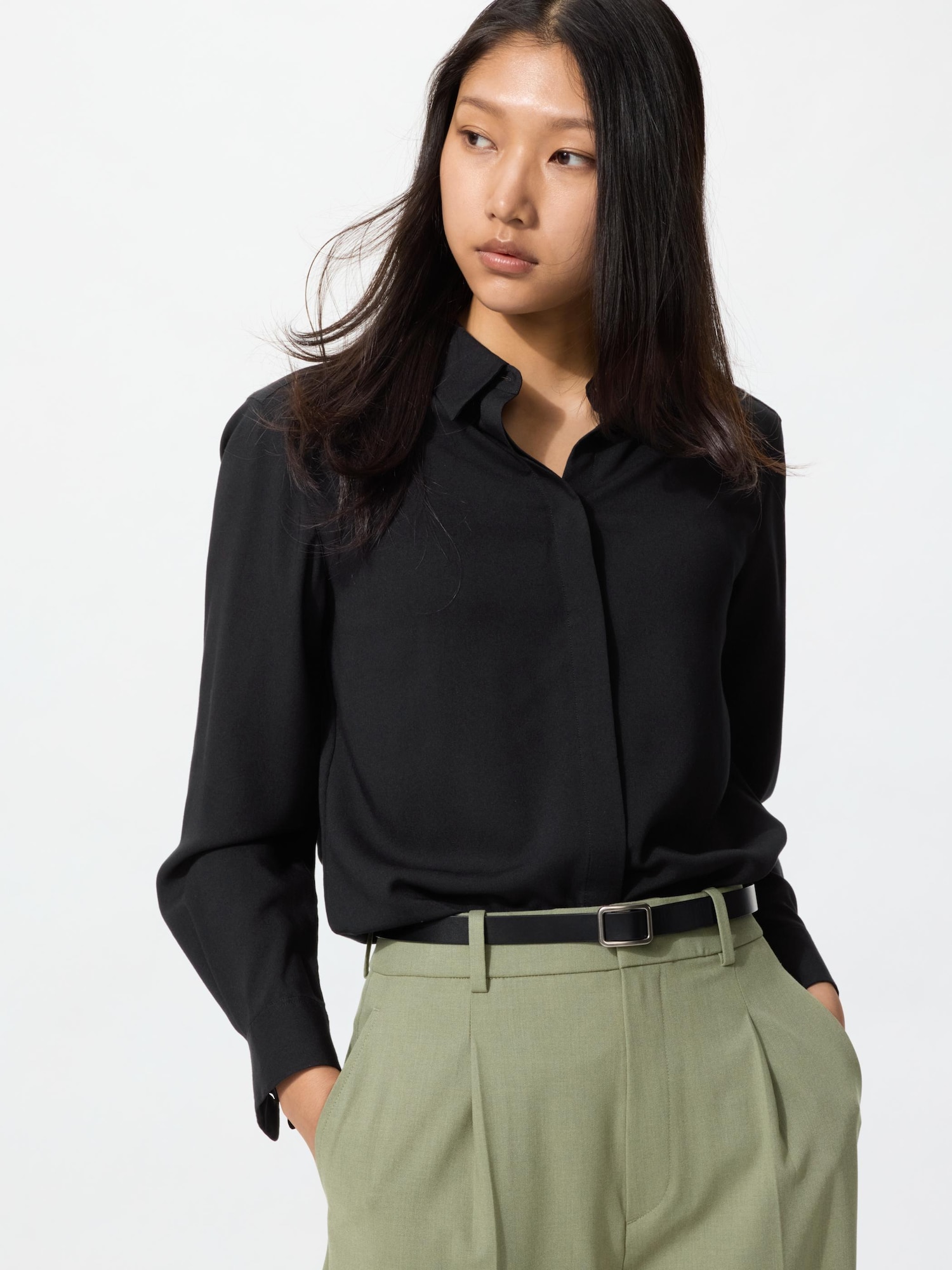 ¥2,990レーヨンブラウスは3年前から愛用しているシリーズです。半袖は長袖と基本は同じで、肩まわりや全体のフィット感がより良くなっている印象です。着丈がやや短めで、夏はタックアウトでもバランスよく着られそうです。比翼仕立てで見た目がすっきりしているのも気に入っています。