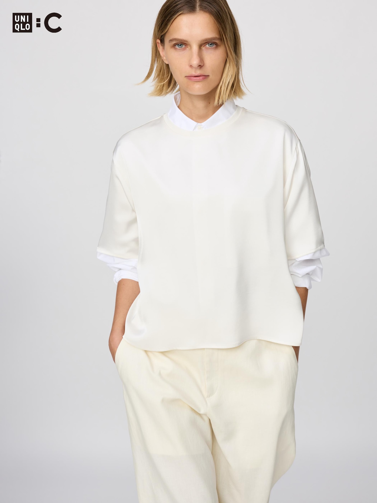 ¥2,990襟付きのレーヨンブラウスと同じサイズ感かと思ったのですが、後からサイズ表見たら裄丈は襟付きのに比べて1サイズ上の長さなんですね。スーツのインナーにしてみたら袖がはみ出てびっくりしました。袖はギャザーなので、ふんわりゆったりシルエットになります。ジャケット着たら袖が押しつぶされて縦方向にいっぱいシワがついてしまいました。普段Lサイズ買ってるんですけど、スーツのインナーとして考えるならMの方がもたつかないかな……洗濯のしやすさは他のレーヨンブラウスと同様でした。
