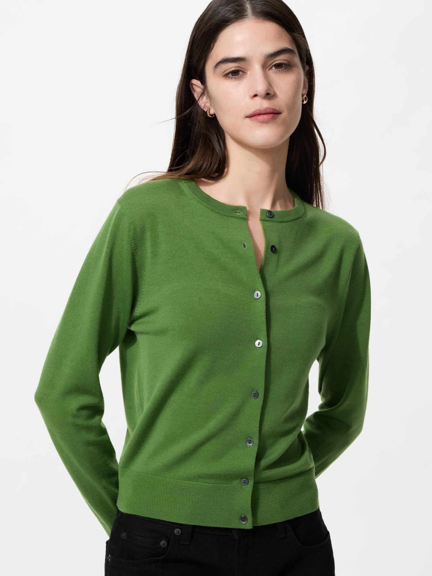 私は暑がりなので、冬でも室内ではウールのセーターやカーディガンは着ません。長袖シャツだけでは寒い時に、ウールほど暖かい(暑い)服はいらないけれど、薄い綿のカーディガンでは足りないという時にちょうどいいです。夏に売っていたメンズの厚めのエアリズムカーディガンを冬にも着ていましたが、男性の上司と被るのでいやでした。ボタンは安っぽいです。私は身幅が大きいので身幅に合わせたサイズにしても、ショート丈が相まってちょうどよく収まります。袖はリブ部分(5センチくらい)を折り返して仕事をしてます。