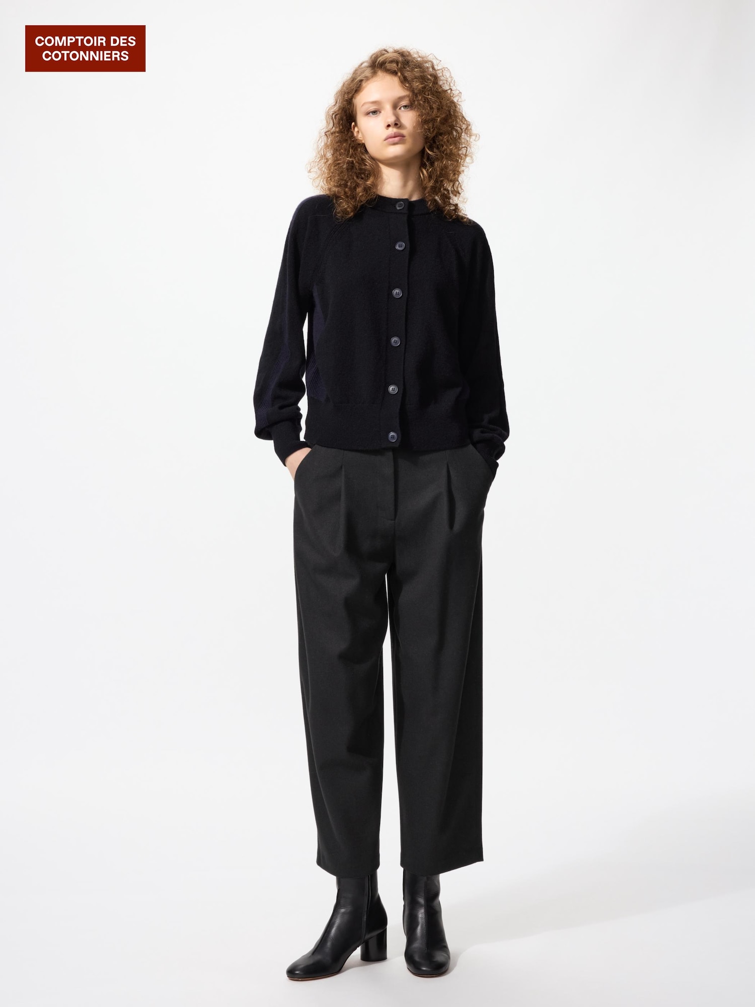 ¥6,990生地感もウール調のジャージ素材で少し肉厚気味で暖かくて良い。自宅で洗えるのも嬉しい。アームホールは広めではないので、下には厚手のセーターなどは少しキツイかも。