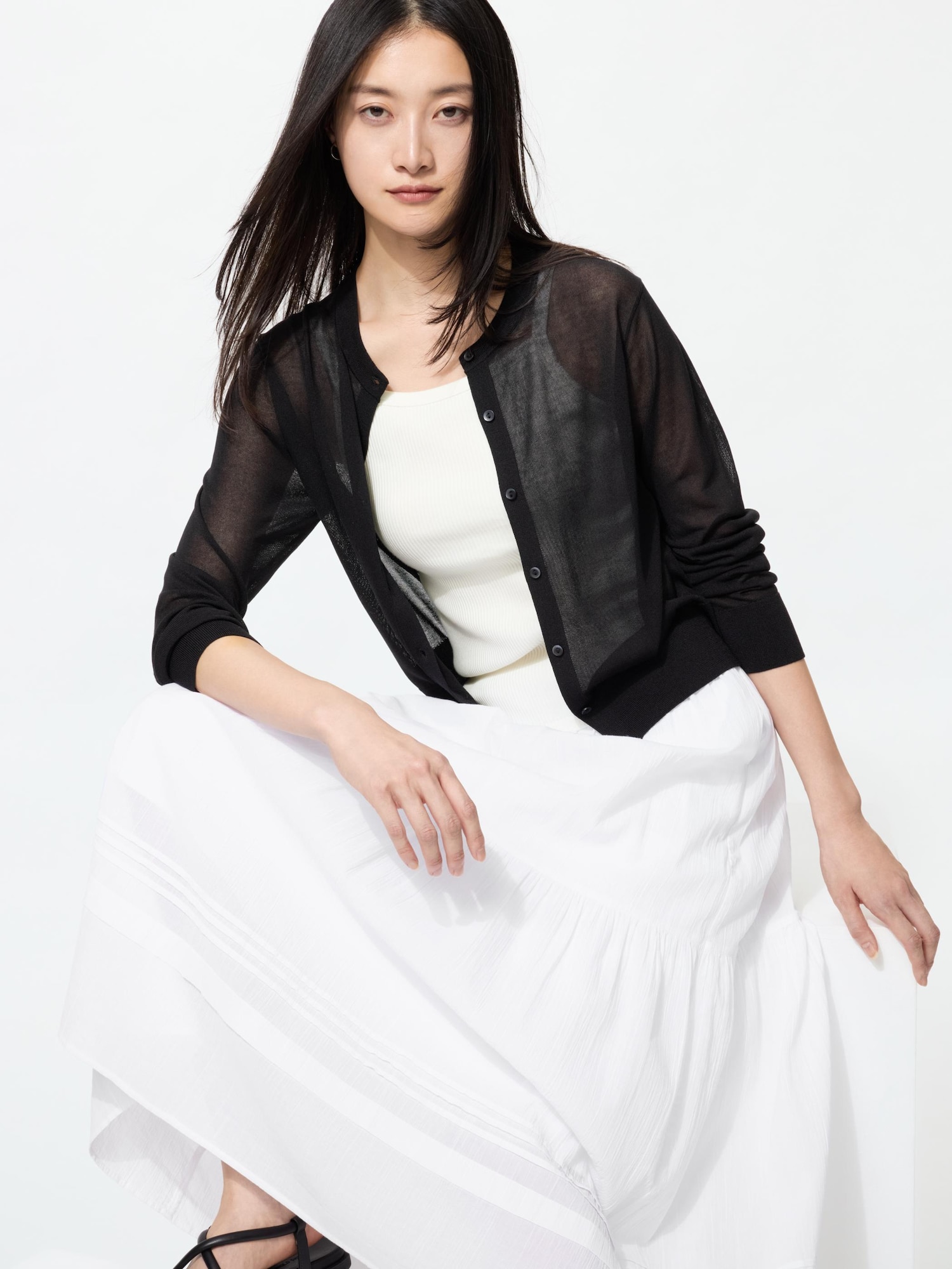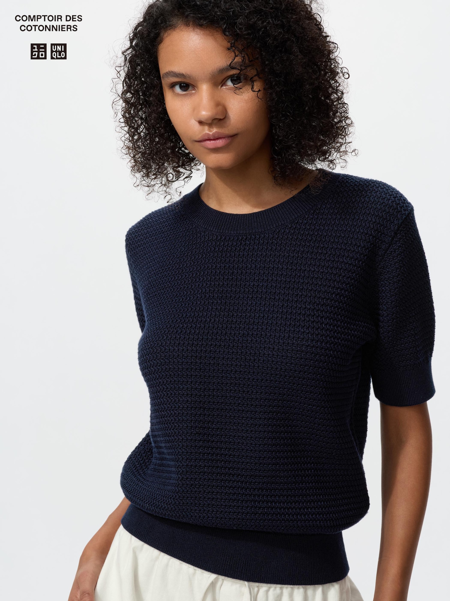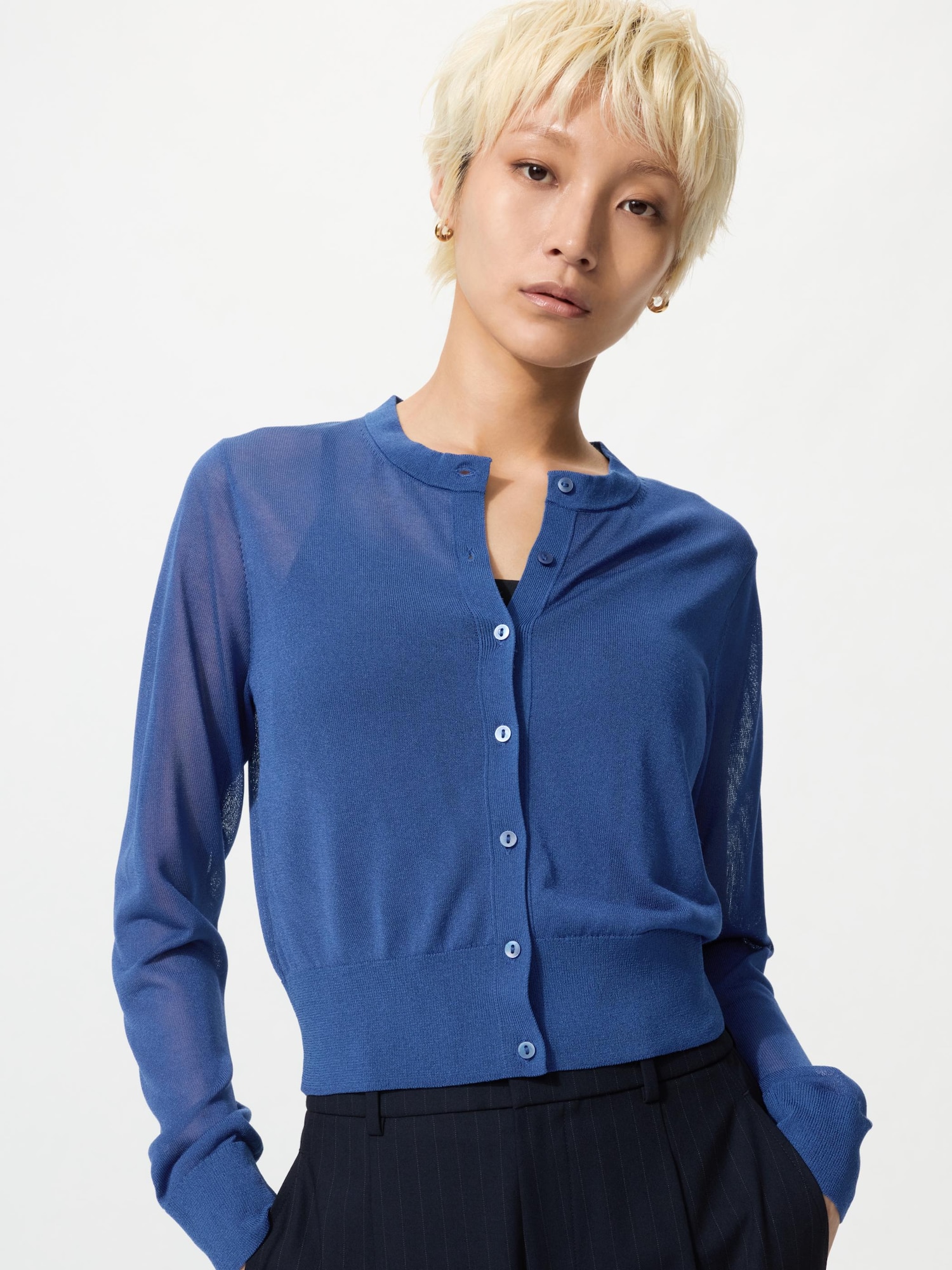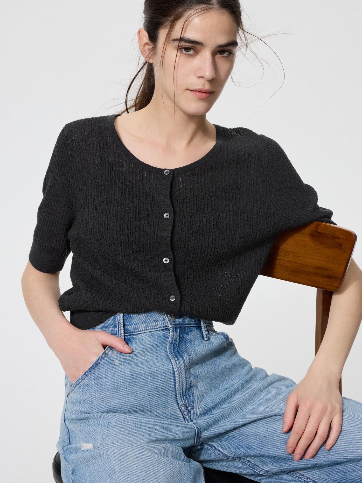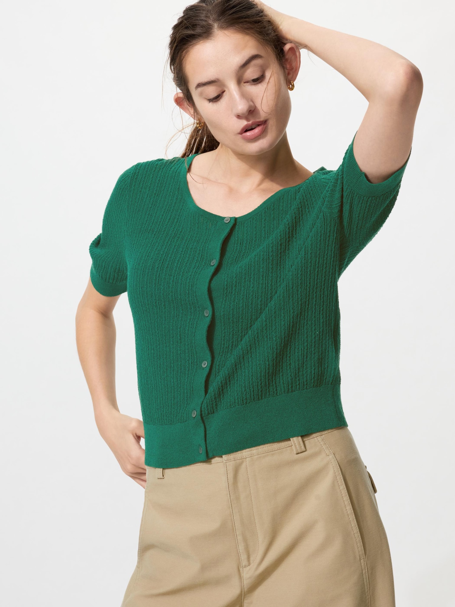 ユニクロには珍しい綺麗めデザインのニット。しかも、長年欲しいと思ってた半袖カーディガン。ぜーったいに欲しい。いつもはお値下げになってから購入ですが、無くなってしまうのが怖くて早々に購入しました。ノースリーブワンピの二の腕隠しにカーディガンは必須。でも長袖だと暑い。なぜ半袖のショート丈のカーディガンって売ってないの?と思い続けてきました。いつもはXXLですが、フィット感細めとあったので3XLを購入しました。まだ試着しただけなので、大きいかどうか今ひとつわからずなのですが、ちょうどよいにしておきました。色違いも購入予定。真夏用にもっと薄手の半袖カーディガンも発売してほしいです。
