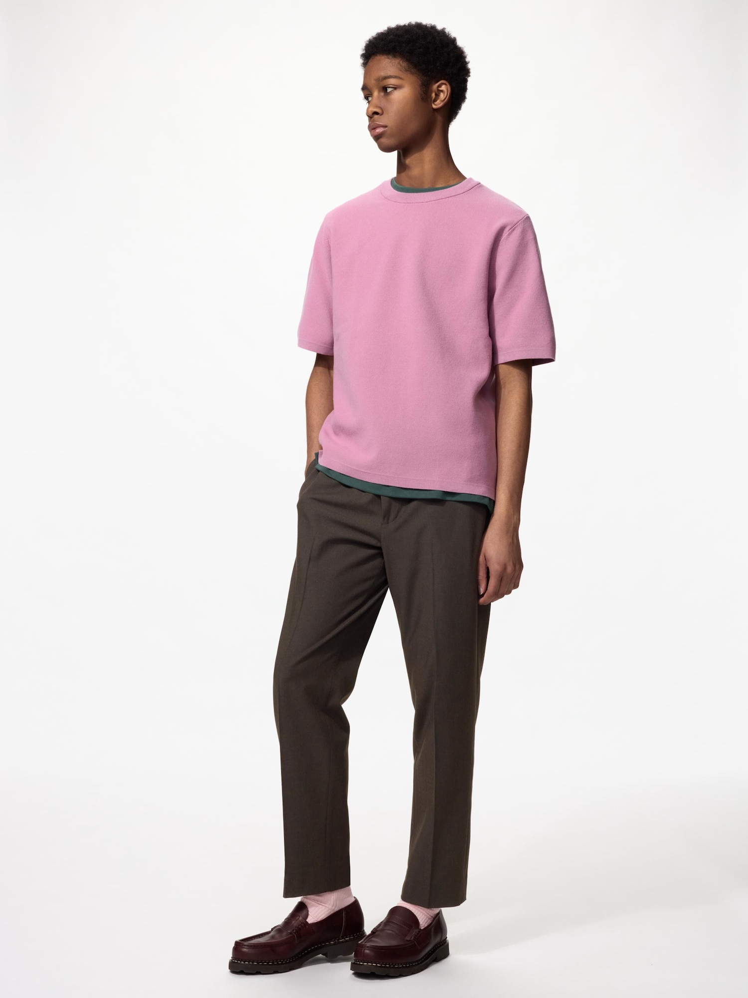 ¥4,990横から見た腰のシルエットがダボっとせずスッキリとしていて良きです!メンズパンツは最低サイズでもかなり大きめなことが多いですがこちらはSサイズで丈も太さも自分にぴったりです。生地感の好みとしてレディースより断然メンズでした。JWAらしいチョコレートのような色、裾を開けてカラーソックスをチラ見せできて気軽に着ながらお洒落を楽しめます。今は中にあったかレギンス履いてますが、夏場もじゃんじゃん履けそうです。