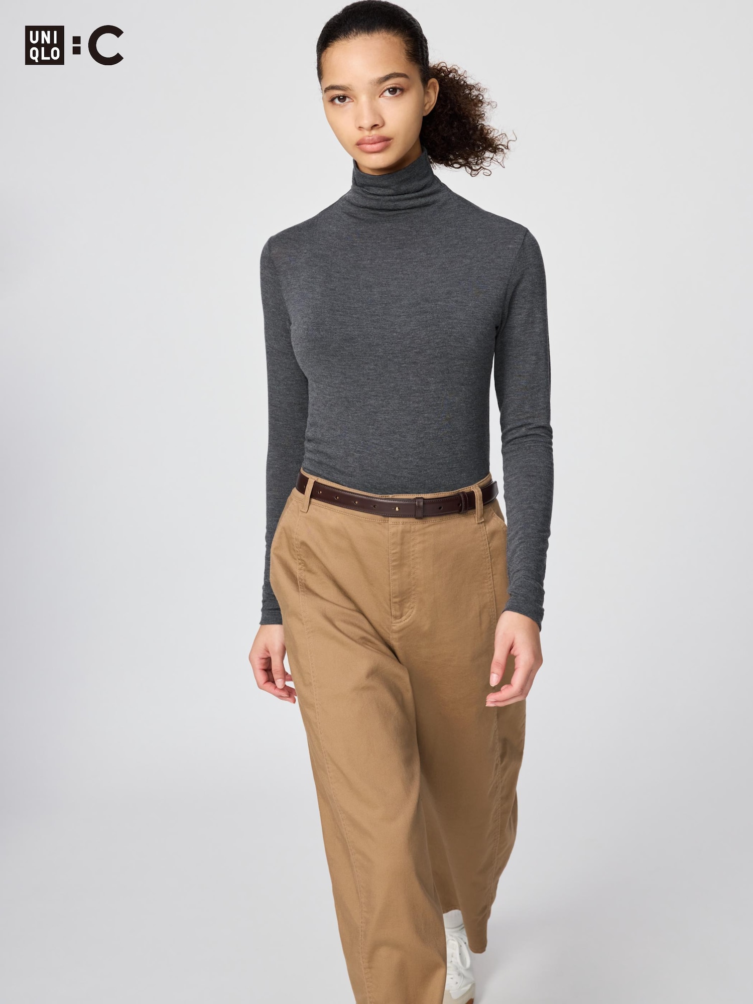 ¥2,990店頭で並んでるのを見て思わず購入してしまいました。私の目にはオンラインの写真より少し緑が入っているように感じます。自称ブルーベース(サマー)なので似合う色味ではありませんが、この色を着たいと思ったので挑戦します。サイズは、普段UNIQLOのトップスはSがジャストサイズですが、今回は体のラインをひろいやすい薄めのリブニットであることと、洗濯で縮むことを想定してLにしました。質感はさらっとしていて、まるでレーヨンが入っているかのような。このエクストラファインメリノのシリーズで、モックネックが出てくれると嬉しいです。そしてインパクトのある色味がもっと増えてくれたら更に嬉しいです。