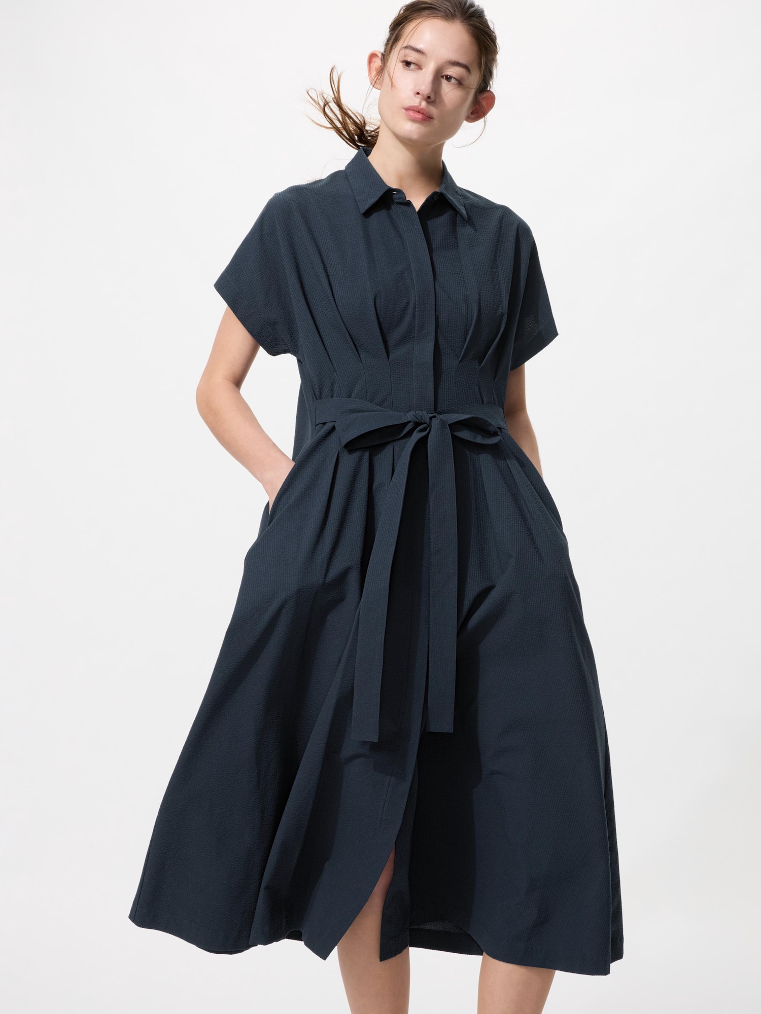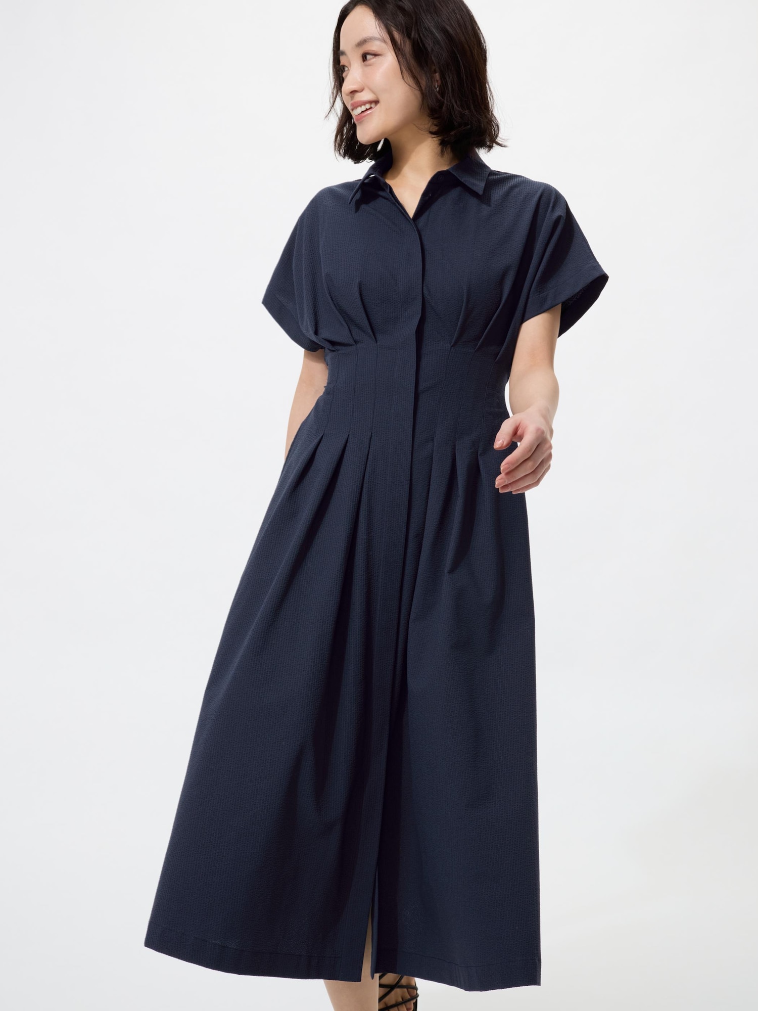 ¥4,990店頭に並ぶ前に試着させていただき、ネイビーのSサイズを購入しました。シアサッカーでサラッと着れます。柔らかく着心地がとても良かったです。素材的にシワがつきにくいと思っていましたが、少し気になりました。紐を後ろで結ぶとスタイルアップしてくれます。タックが入っているので無地でも表情が単純にならず素敵です。