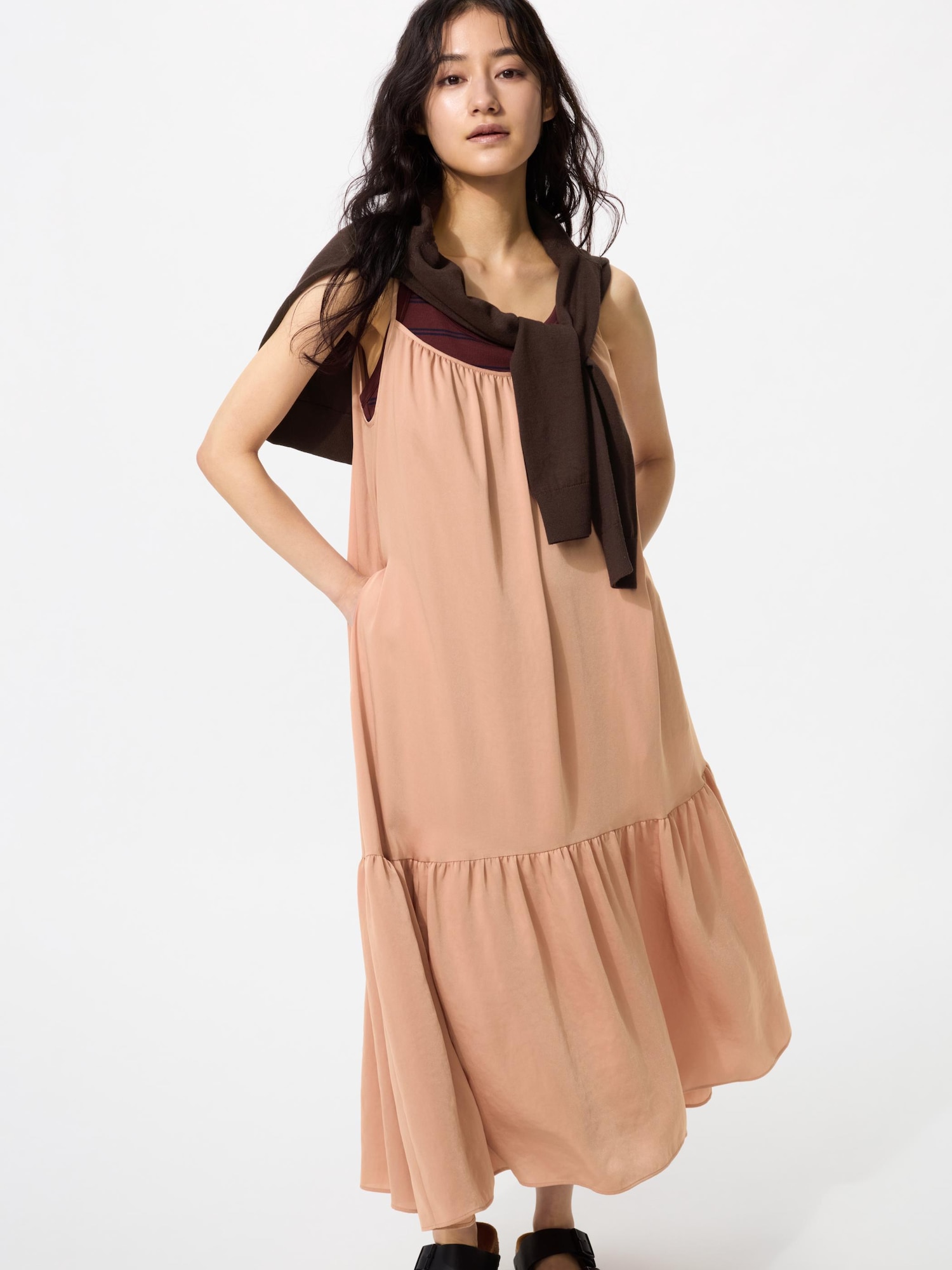 ¥4,990今回のUNIQLOUはこちらのワンピースのみ購入。店頭で試着し即決でしたが、サイズに迷いました。ゆったり目に着たかったのでLにしましたが、骨格や好みでサイズ選びは分かれそうなので、できれば試着をオススメします。サイド・フロント・バックラインはどこからみても綺麗、このお値段でこのシルエットは破格だと思います。