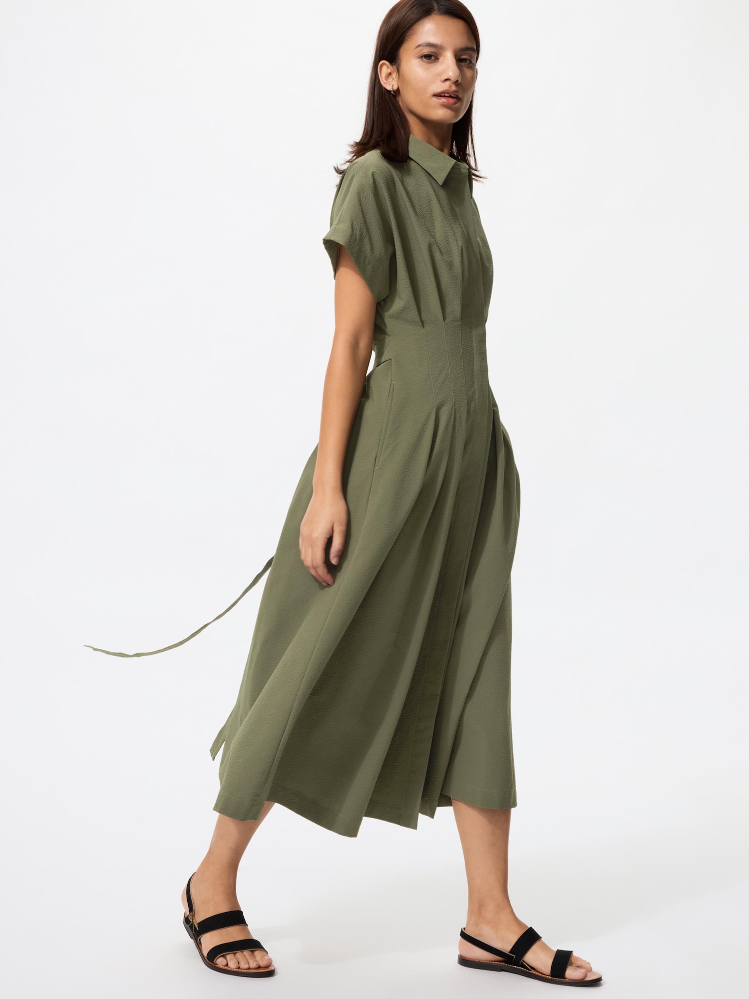 以前のUのTワンピースは一番大きいサイズでも着丈が少し足りませんでしたが、今回のは163cmでモデルさんと同じくらい膝が隠れる長さになりました。裄丈は身幅、肩幅ありの私でもちょうど肘ぐらい、肘を曲げた時に引っかからないくらいです。ブラック、パープルを購入してとても良かったので、全色買いました。ブラウンはエアリズムTの色味と同じです。ライトグリーンは薄ーいメロンカラーで涼しげです。両サイドにポケットがついたのも良き。