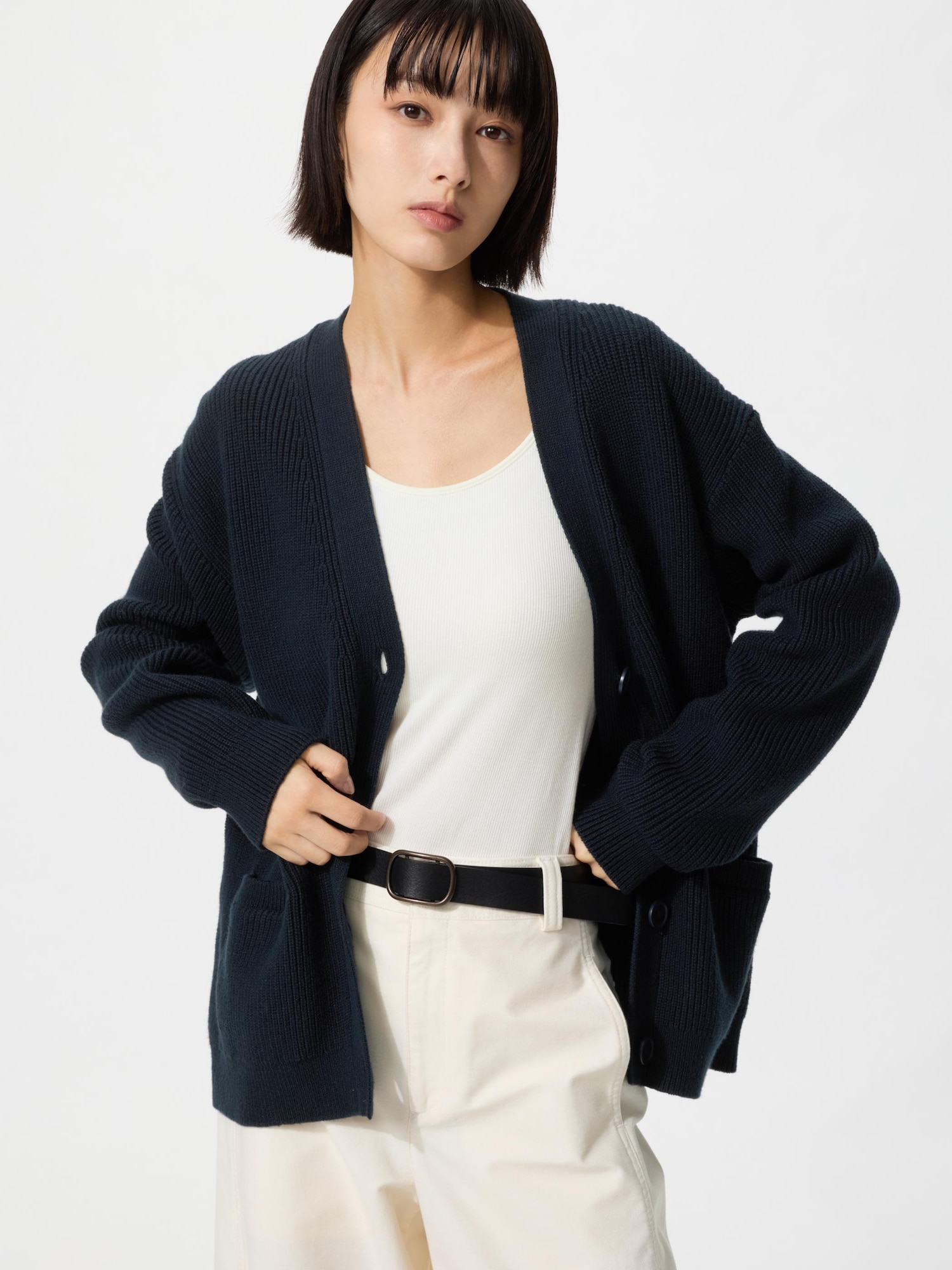 Vネックのメリノセーターは毎年秋〜春のスタメントップスです。今回長年着ていたのが傷んでしまったのでダークパープルとブラックを買いました。オンラインでしか買えず‥で不便なのでどうか店頭でも買いたいです。またメリノVネックのレディース、カラバリ欲しいです。Sでも大丈夫ですが、中にエアリズムの長袖白Tを着たいのでМを選んでいます。程よいゆとりがあります。メンズアイテムのせいか、Vも深すぎなくて良いです。来年も買い足すと思います。