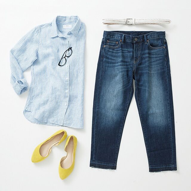 カットオフ仕様のスリムボーイフレンドフィットジーンズは、ヴィンテージウォッシュ加工された、ネイビーとブルーの2色展開。麻100%のシャツにはネイビーのデニムを合わせて、爽やかなプレッピールックに。