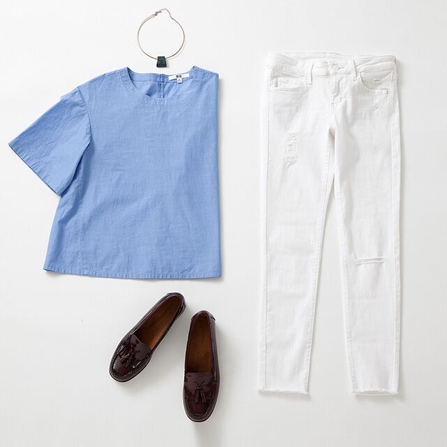 細身のウルトラストレッチジーンズは、旬のボリュームトップスが好バランス。ホワイトデニムに最適なブルーの幅広ブラウスを合わせて、クリーンな印象に。