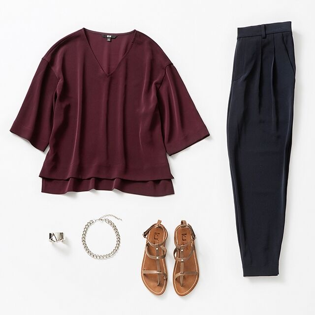 大流行中のセットアップ。秋は、トップスとボトムスが同色のワントーンコーデではなく、上下で配色を変えた、新スタイルへバージョンアップ。深みのあるトーンでリンクさせ、ボルドーのドレープVネックブラウスと、ネイビーのドレープジョガーパンツを組み合わせる。シックな配色バランスが効いた、高感度な大人のきれいめスタイルが完成します。