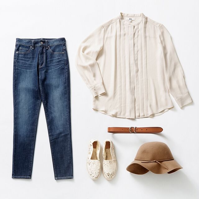 ジョーゼットピンタックブラウスは、深めのまた上が特徴的なハイライズウルトラストレッチアンクルジーンズが好相性。高めのウエスト位置でマークし、70年代テイストを意識したスタイリングに。優しいピンタックをふわりとしたシルエットで着こなすために、デニムにタックインがおすすめ。色味を抑えて、キャメルのウールハットやレース使いのシューズなど、上質な小物を加えてクラシカルなムードを演出。