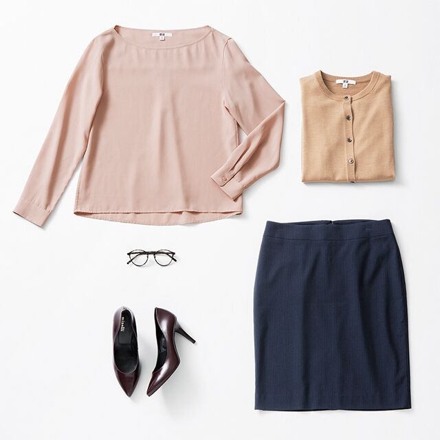 淡いピンクのレーヨンエアリーTブラウスは、ネイビーのタイトスカートで甘さを引き締めて、好感度がマックスの上品フェミニンなオフィススタイルが完成します。