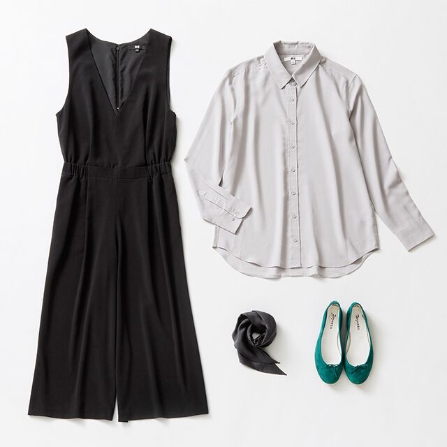 夏はTシャツやノースリーブトップを合わせた、オールインワン。秋にかけては、長袖のレーヨンエアリーブラウスをインして、大人っぽくイメージチェンジしたい。写真のニュアンスグレーやとろみ素材で、マスキュリンな中にも女性らしさが香る着こなしに。