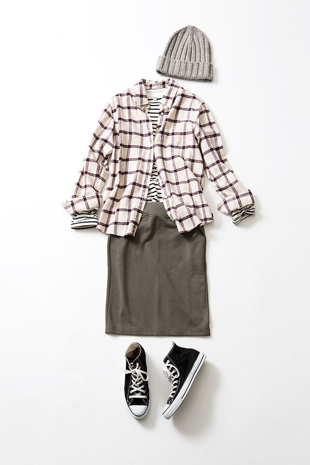 フランネルチェックシャツを新鮮に見せるには、まずはナチュラルな色使いに注目を。シンプルなチェック柄に合わせて、カーキのスウェットスカートやグレーのニット帽など、定番アイテムをニュアンストーンでまとめます。シンプルなチェックだから、ボーダートップスとの柄オン柄も、自然に決まる大人のカジュアルに。ボーダートップスをインしたり、袖をまくったり、自分流の着こなしが新鮮。