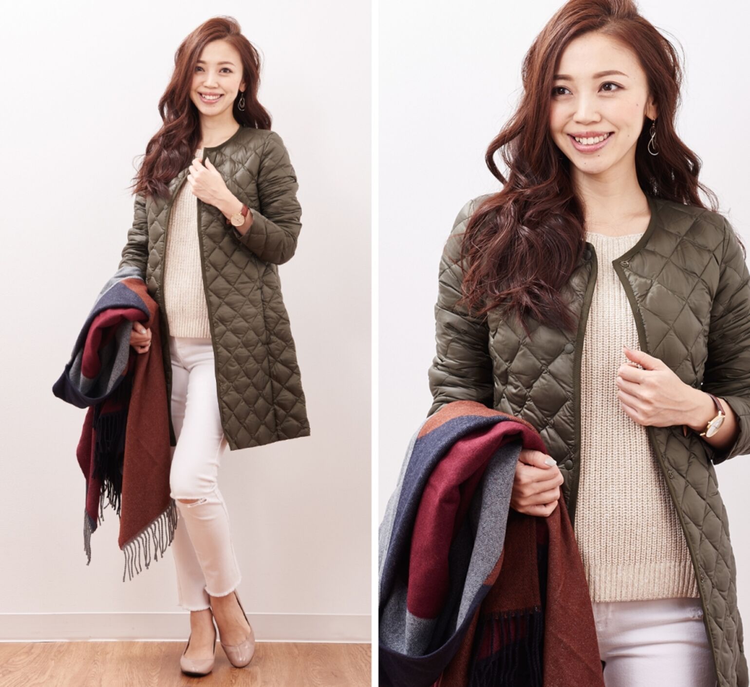 「寒いとダウンが着たくなりますがカジュアルになりがち。ノーカラータイプのウルトラライトダウンなら、ダウンでもエレガントに見えるので、ベージュやホワイトなど上品な色使いでまとめます。また差し色として秋冬らしいカラーのストールを持つだけでメリハリにも。ウルトラライトダウンは小さく収納できるので、いくつあってもクローゼットの邪魔にならないというのも重要ポイントです」