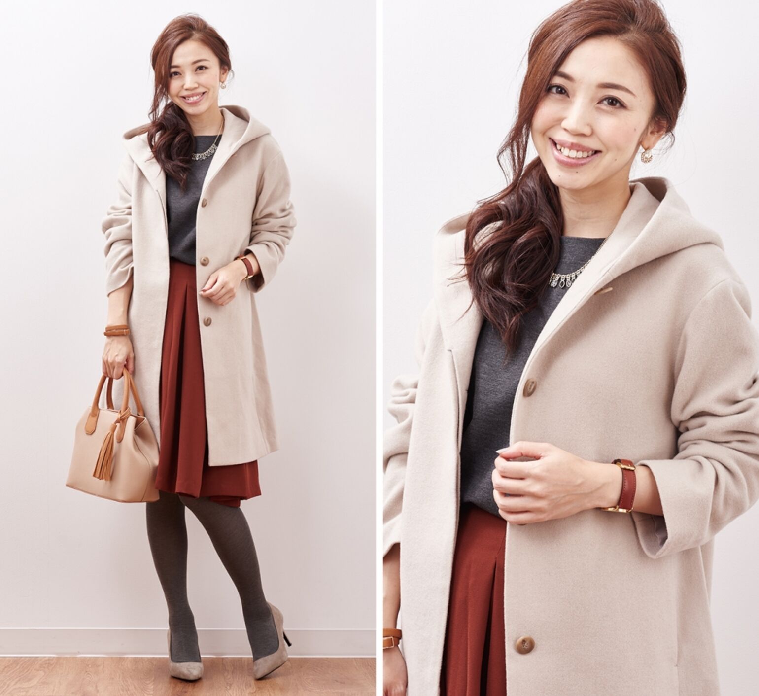 「一目惚れしたコートがこちら。少し大きめのシルエットとフードにもボリュームがあり、今年らしいビッグシルエットのウールコートですが、王道のコンサバコーデの“抜け”アイテムとしても着回しができるところが優秀。どんなコーディネートにも合わせやすく、年齢を問わず着こなせるコートだと思います。フード付きなのでヘアはまとめてサイドに集めて、すっきり見せつつ顔まわりに華を添えます」