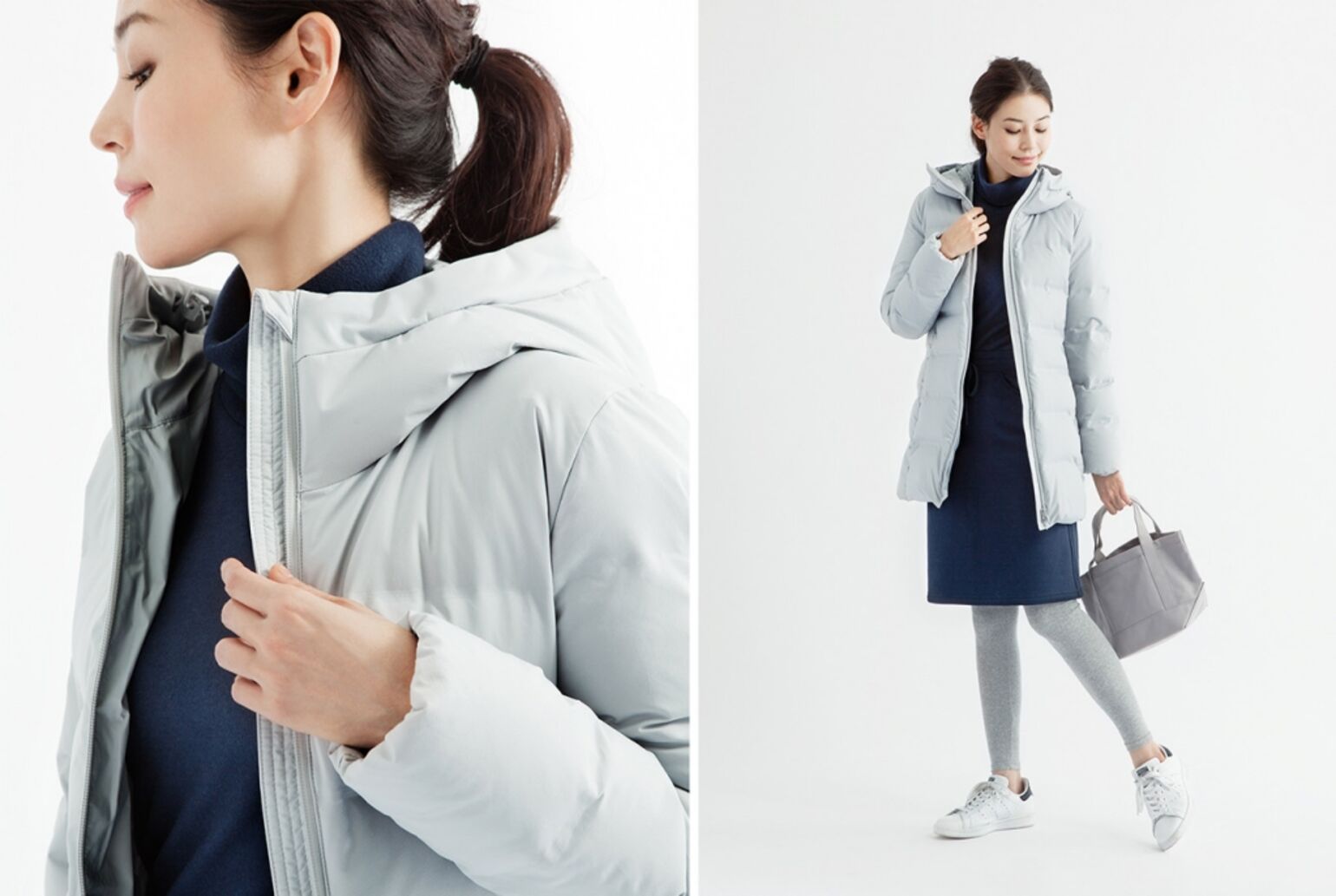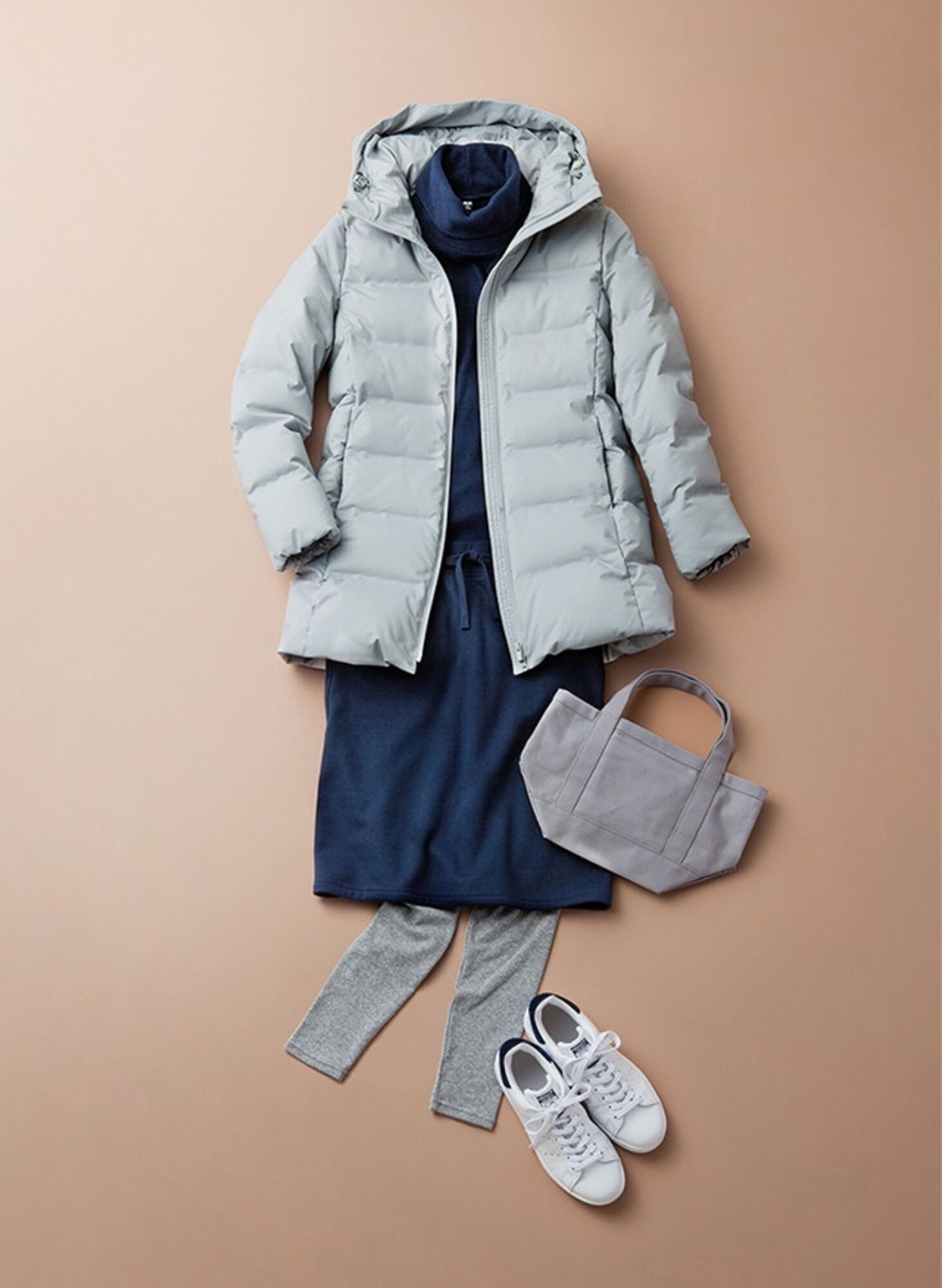 遊び心のある豊富な色展開から、クールな印象のライトグレーをチョイス。ネイビーで揃えたトップスとスカートに、ダウンのカラーに合わせたレギンス&ミニバッグをセレクト、足元は清潔感のある白スニーカーで今年らしいスポーティミックスコーデに。近所へのお買い物スタイルも、シンプルかつ一歩先行く洗練された印象に仕上がります。