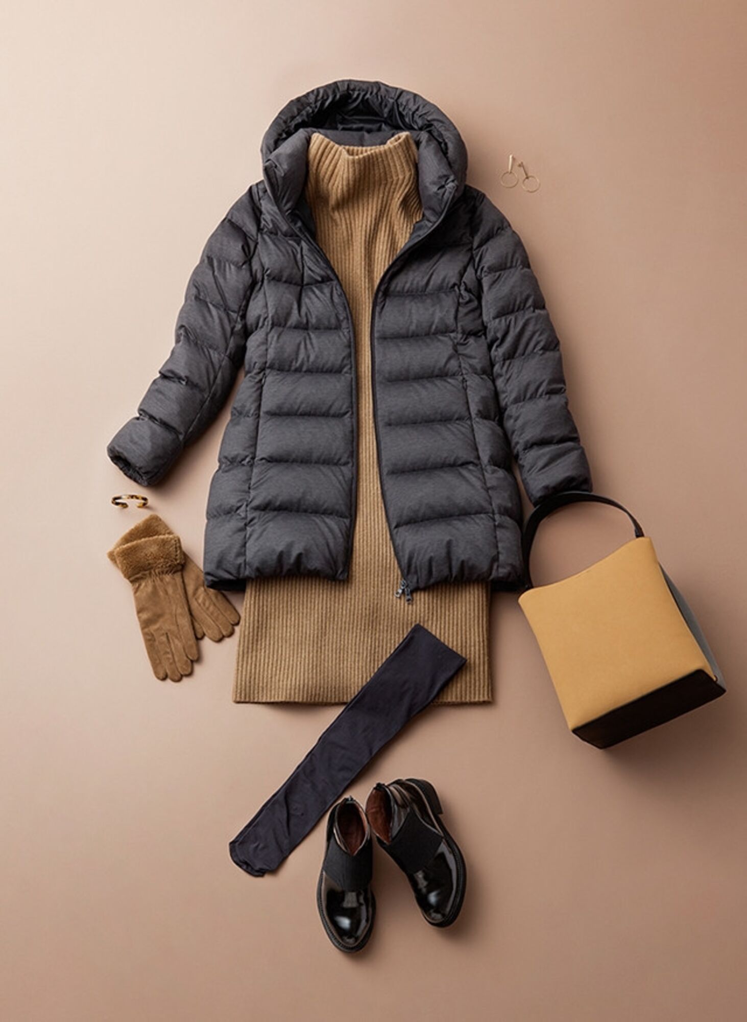 友達とのお出掛けには、万能ダウンをエレガントにコーディネート。グレーのダウン×キャメルのニットワンピの色合わせで、トレンドカラーを上品に取り入れて。ダウン特有の光沢のある表面でなく、ウールのようにマットな素材感がコーディネートを大人っぽく上品な雰囲気に仕上げてくれます。