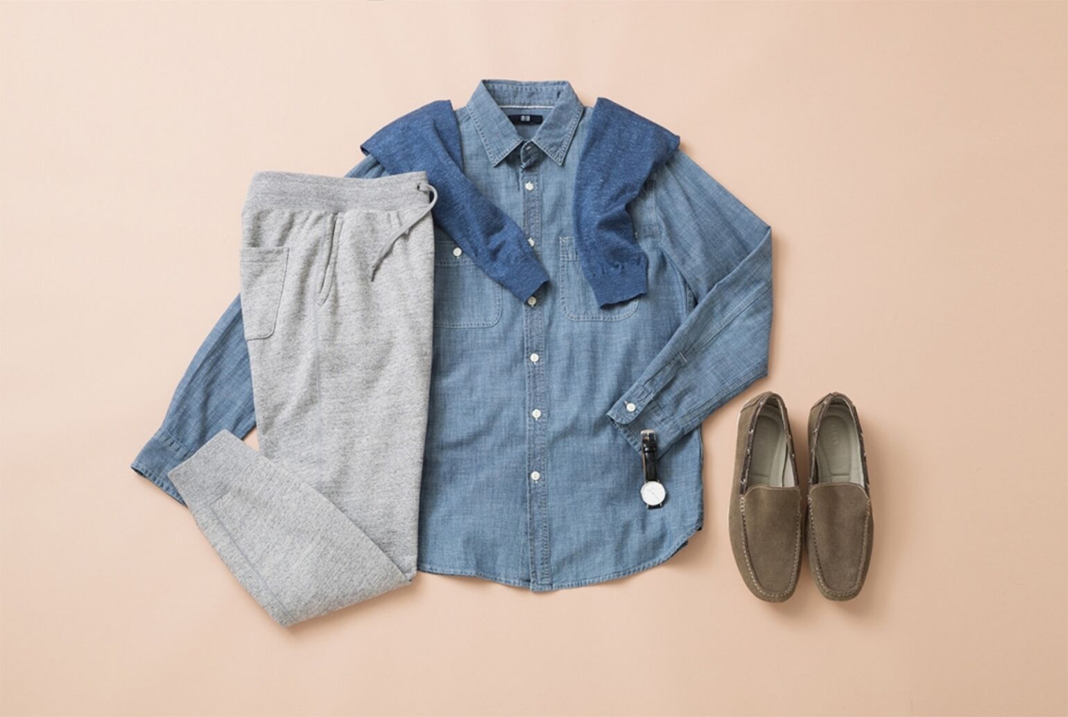 スポーティな要素も持つスウェットパンツを穿きこなすには、コントラストを際立たせることがスタイリングの重要なポイント。例えば、トップスにシャンブレーシャツ、足元にはスエード素材のローファーをチョイスするなど、カジュアルシックなアイテムと合わせることで、旬のスポーツミックススタイルを簡単に楽しむことができます。カーディガンの肩がけや、時計など、さりげないアクセントも忘れずに。