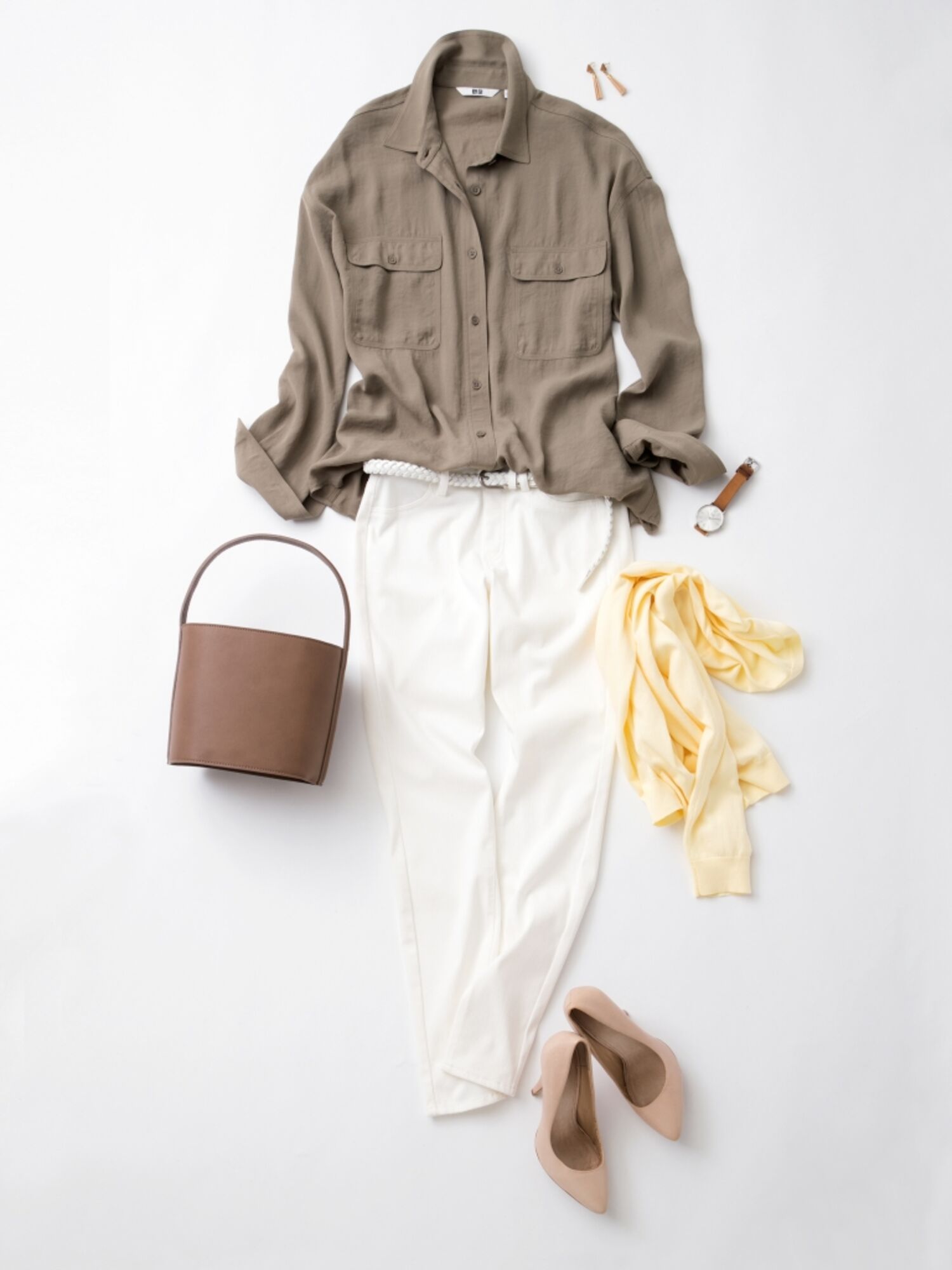 凛々しい印象のワークシャツは、レギンスパンツなどのカジュアルパンツとも相性抜群。着心地が良く柔らかな薄手の素材なので、ボトムにインしやすいのもおすすめポイントの一つ。爽やかな白パンツには同色ベルトをオンして、バッグとアクセサリーは女性らしくエレガントなベージュカラーでまとめて。春らしいイエローのカーディガンをアクセントに。