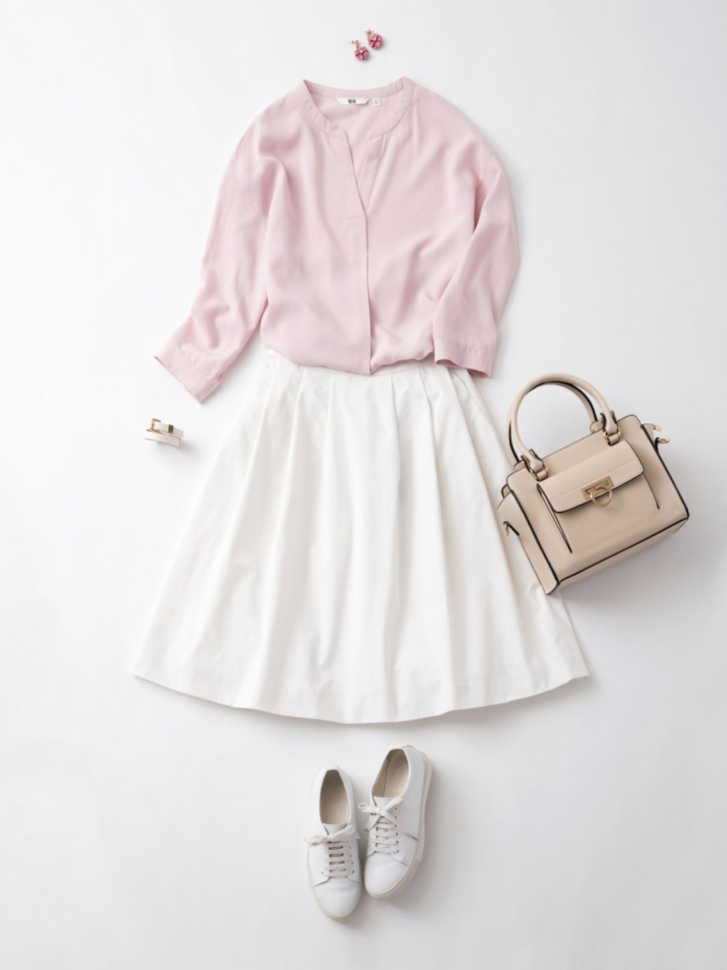 スキッパーカラーブラウスはAラインスカートを合わせて、全体をふんわりシルエットで女性らしく!流行カラーとしても要注目の大人も着やすい淡いピンクを主役に、全身を春らしいペールトーンでコーディネート。足もとはスニーカーで今年らしくカジュアルダウン。脇スリットなので、フロントのみをボトムにインするのもおすすめです。