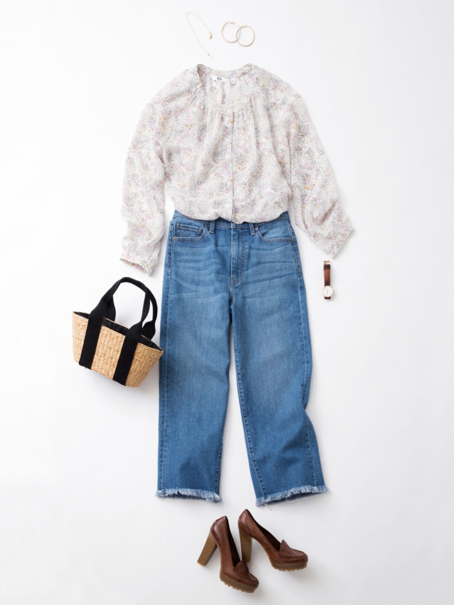 ヴィンテージライクな花柄が今年らしいシフォンブラウスは、トレンドのワイドジーンズともベストマッチ!フープピアスにかごバッグ、ウェッジローファーを合わせれば、どこか懐かしさを感じる70’sな着こなしが完成します。今っぽく着こなすなら、ブラウスもボトムにインがおすすめです。