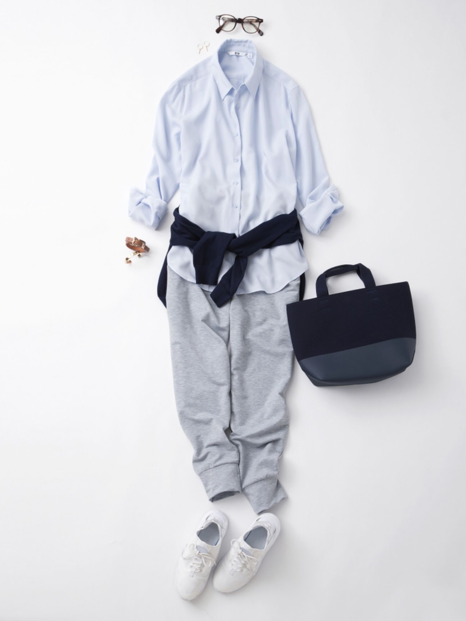 今までとは一味違う新しい着こなしを楽しみたいなら、スウェット風のパンツを合わせて今年らしいスポーツミックススタイルもおすすめ。カジュアルに着崩したシャツには、バッグと色を合わせたネイビートップスの腰巻きでコーディネートにピリッとほどよいアクセントを。メガネやピアスなどの小物もプラスして、こなれた大人カジュアルに。