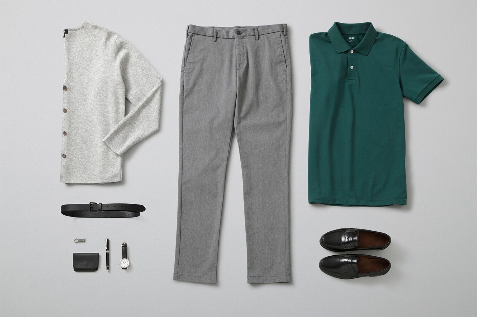グレーのチノパンに同トーンのカーディガンをオン。インナーにグリーンのポロシャツを合わせスパイシーなアクセントをプラスするなど、色使いで遊び心を効かせたコーディネート。小物をブラックでまとめたシックなスタイルなので、オフィスカジュアルとしても活用いただけます。
