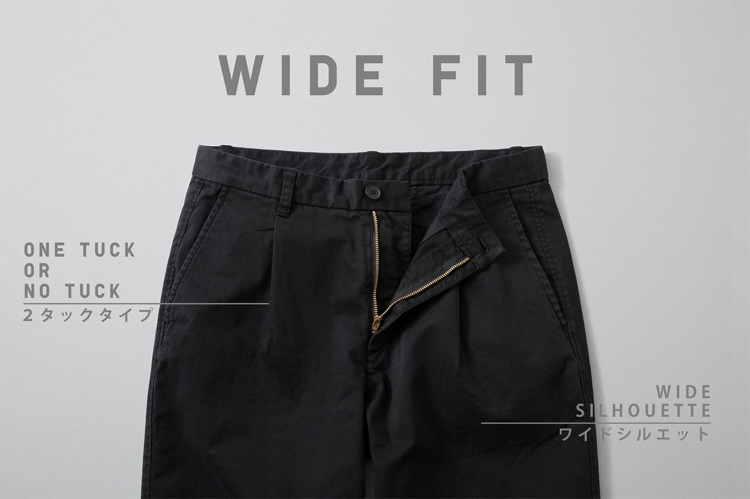 “大人でも穿きやすいワイドパンツ”をコンセプトに開発したワイドフィットチノ。すっきり見えるノータックと立体感のあるワンタック仕様の2種類をご用意。どちらも裾にかけて緩やかにテーパードにさせることで、丸みを帯びながらも上品なシルエットを実現しました。今季らしいトレンド感のある仕上がりが魅力です。