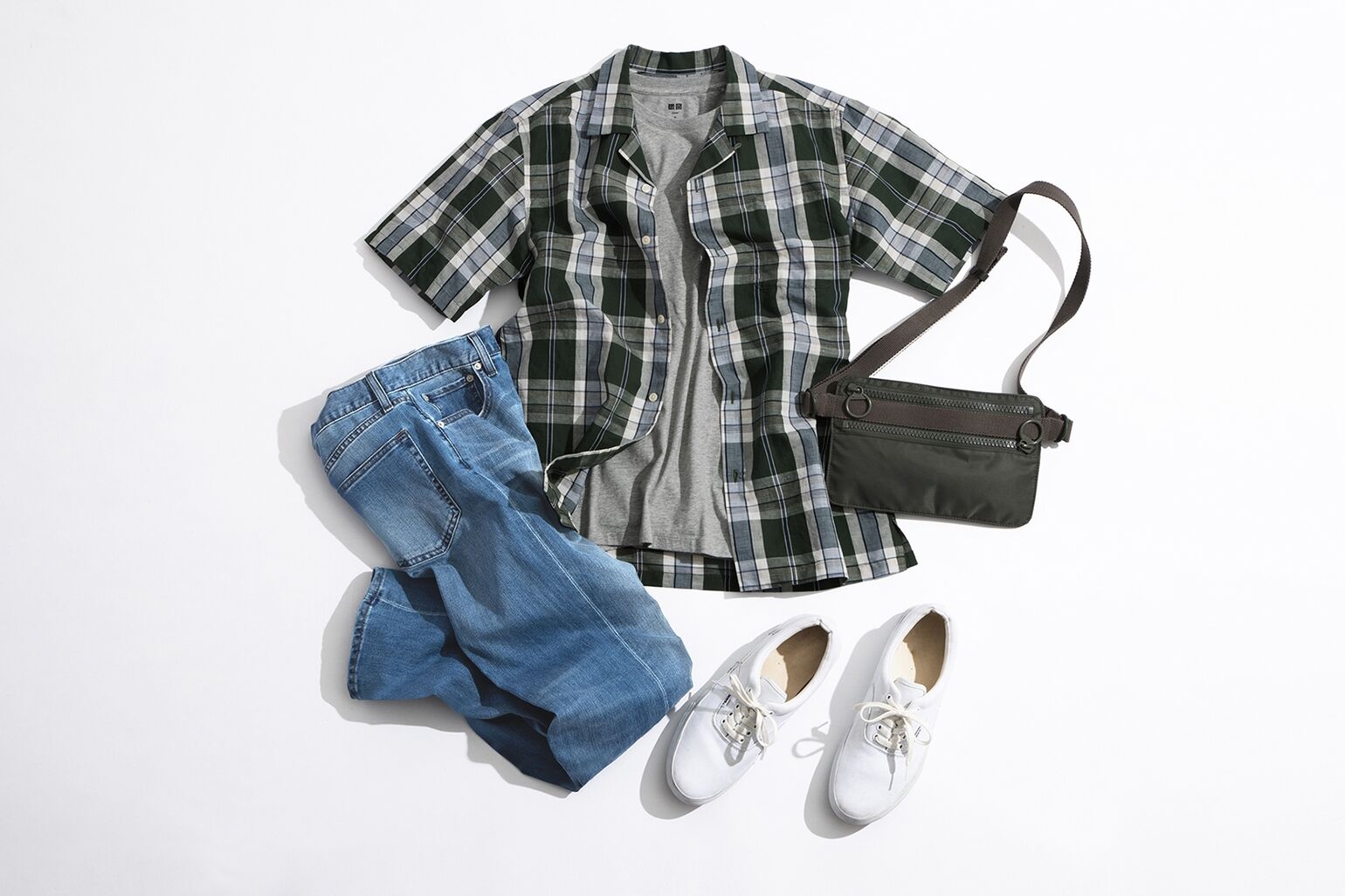 ディープグリーンを基調としたシックなチェック柄が魅力のオープンカラーシャツには、無地Tと色落ちデニムをコーデし男らしく。バッグのカラートーンをシャツに合わせ、ホワイトのスニーカーでまとめれば、上品さが漂う新鮮なアメカジコーデが完成。