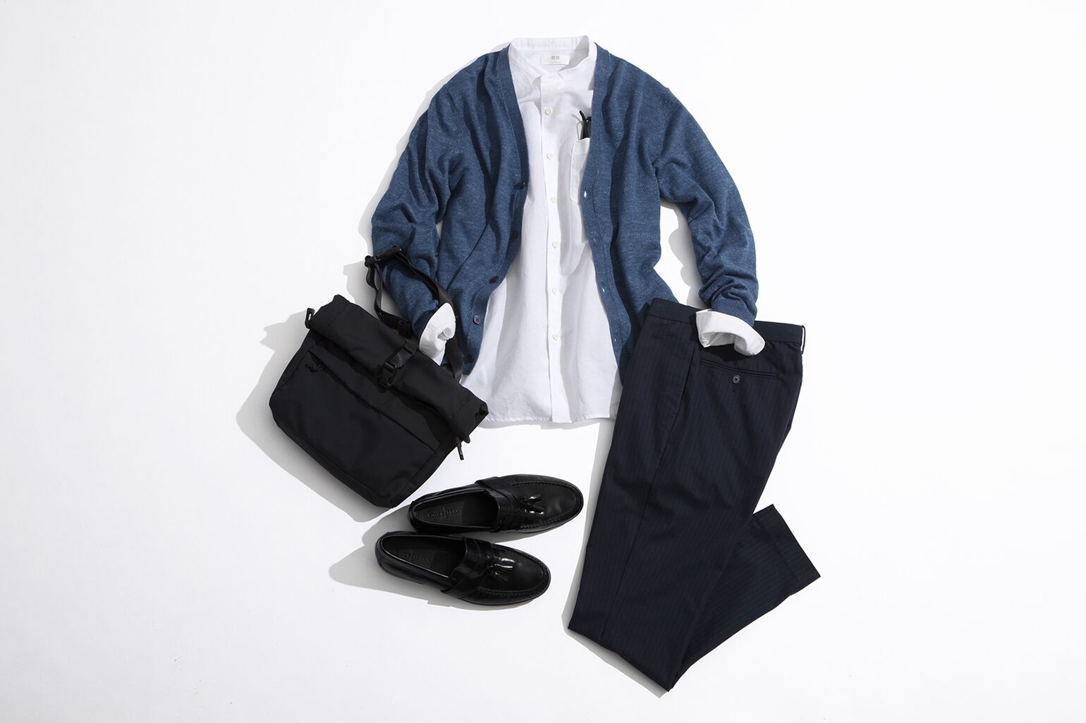 薄手のカーディガンにスラックスを合わせたビジネスカジュアルコーディネートも、スタンドカラーシャツを取り入れるだけで一気にトレンド感溢れる旬のスタイルに。タッセルローファーや眼鏡、スポーティなバッグを合わせることで、ワンランク上のコーデが完成。