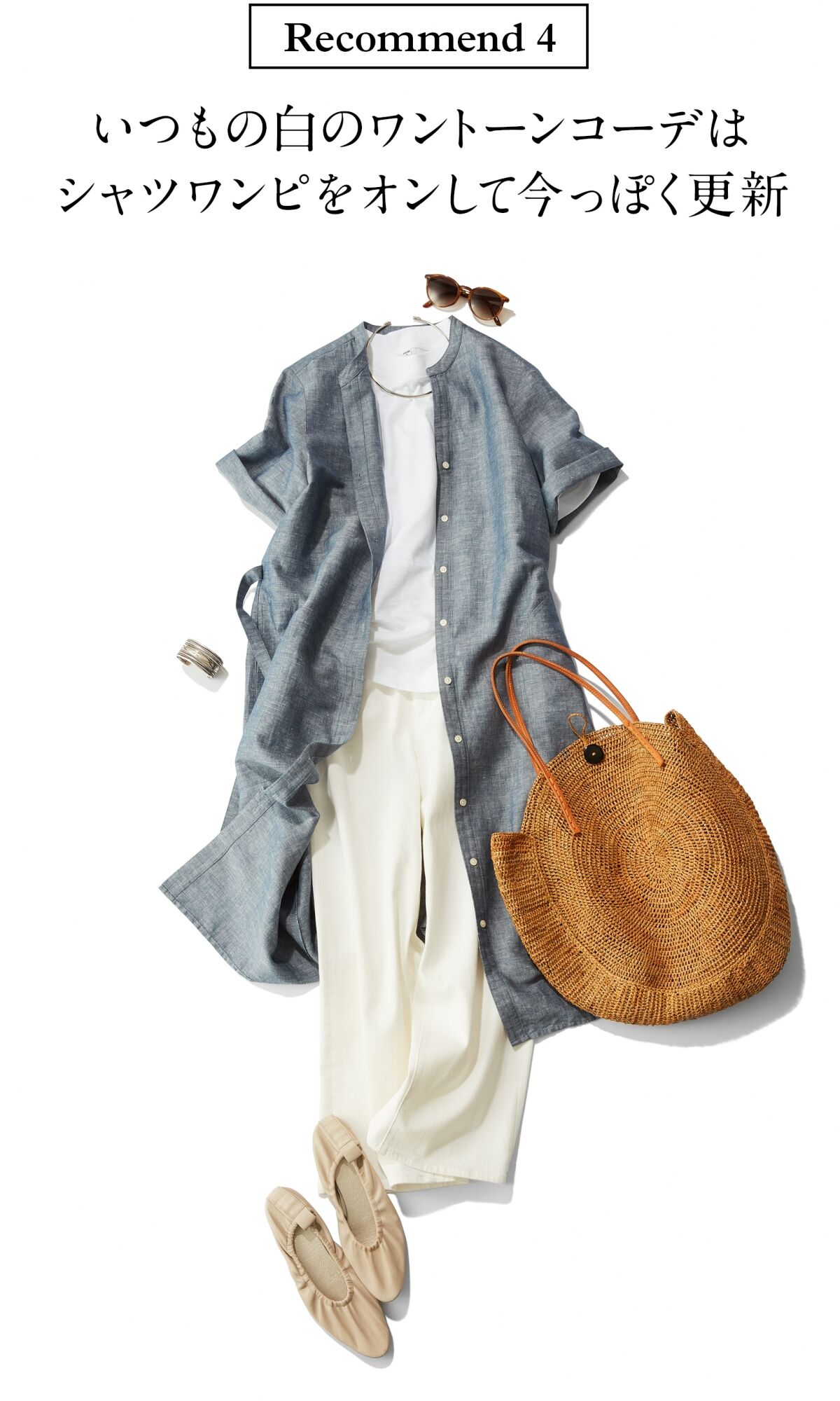 「さわやかな白T×白デニムコーデも、そのままだと今年はシンプル過ぎてちょっと物足りないくらいの気分。しかも6月はまだ朝晩が肌寒い日もあるので、シャツワンピを羽織りもの代わりに取り入れるのは実はとても便利なんです。長め丈のシャツワンピの下に、あえて太めシルエットのデニムを合わせて今年らしく仕上げるのもポイントです。白Tに合わせたボトムは、ワイドのクロップド丈。長め丈のシャツワンピの下からちょっと太めシルエットのデニムがチラリと見える方が、ぐっと今年らしい雰囲気に。シルバーアクセとも相性ぴったりです。デニムなららくちん&シワも気にならないので、たとえば家族との長時間ドライブでお出かけの日などにもおすすめのコーディネートです」