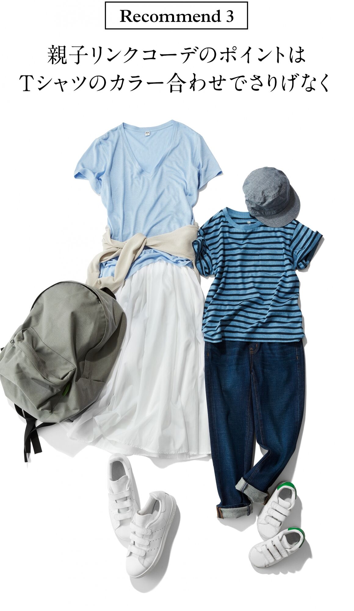 「淡いブルーはそれだけでフェミニンですが、さらに透け感のある白のふんわりコットンスカートで女らしさをもう1さじ加えて。明るめトーンの掛け合わせなら、曇りがちの日にもパッと華やいだ印象に仕上げてくれます。スポーツ小物が大活躍する子どもと一緒のお出かけの日こそ、実はこのくらいフェミニンなコーデをベースにするのがオススメです。リュックや白スニーカーが加われば甘さも抑えられつつ、ヘルシーな女性らしさが引き立ちます。子どもとはTシャツのベーストーンをさりげなくリンク。それだけでも統一感が感じられ、さりげない、清潔感のある親子のリンクに仕上がります」