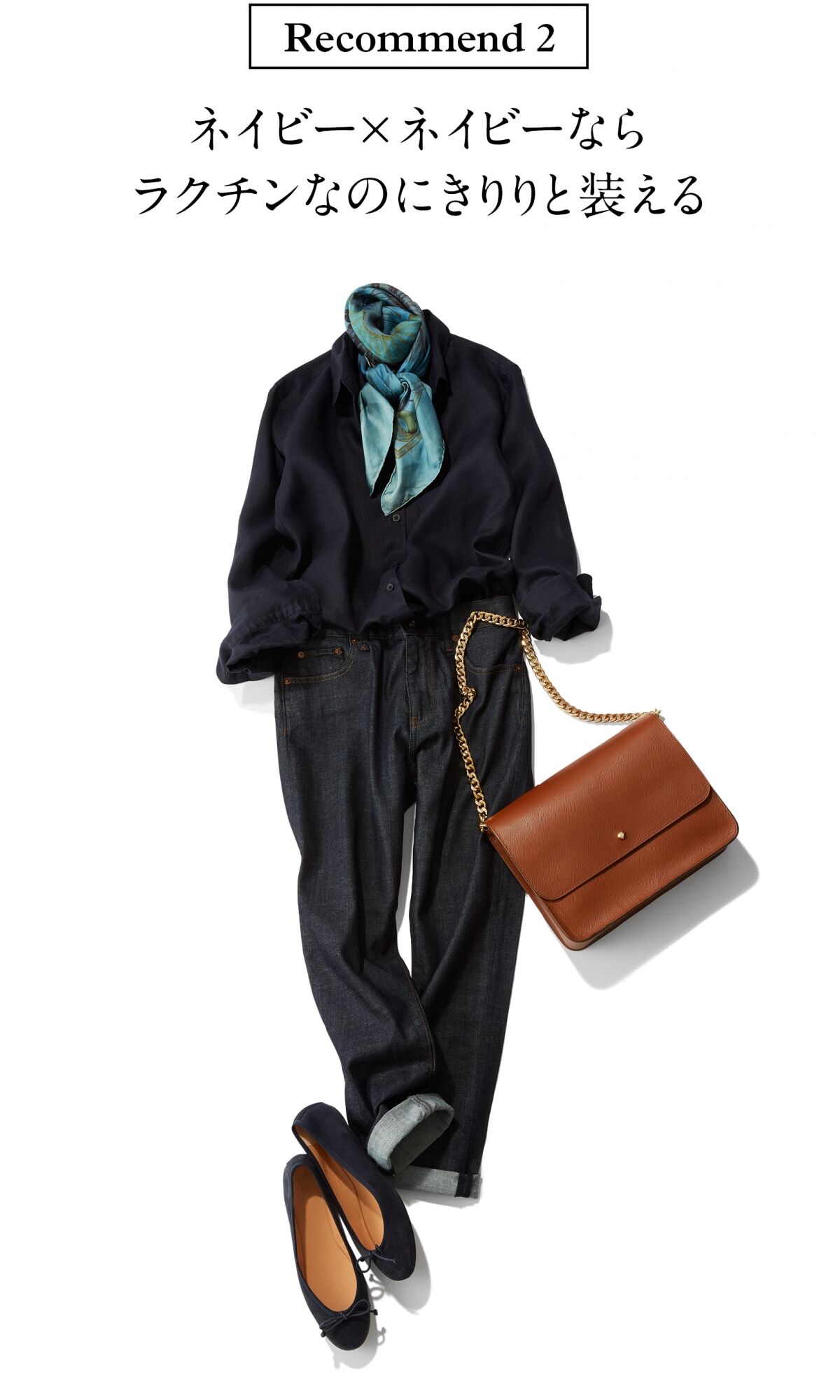 「カジュアルなリネンシャツは濃いめのストレッチデニムを合わせて、らくちん&ストレスフリーなのに、どこかきちんと感のある着こなしに。ネイビーという洗練カラーの力を借りることで、何気ないデニムスタイルも上品な装いに仕上がります。靴もバッグもベーシックカラーで合わせれば、さらに落ち着いたムードのあるスタイリングに。この時期の濃いめカラーは、雨の日でも明るめカラーに比べて濡れた跡が目立ちにくいから、雨の中外出する日には特におすすめです。そういう日こそお気に入りのスタイリングでお出かけできたら、それだけで1日気分良く過ごせそう!」