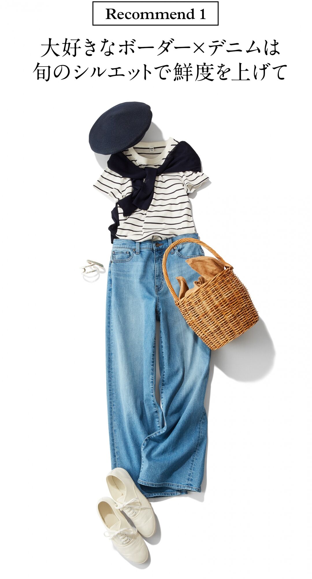 「春夏シーズンに1本は抑えておきたいトレンドのハイウエストのワイドジーンズ。シルエットがとてもきれいで脚長効果も期待できます。明るすぎず深すぎないブルートーンは着まわしやすさも抜群なので、ワイドデニム初心者さんにもオススメです。合わせたのはリブ素材ボーダーT。ハイライズデニムにウエストインさせても、素材の凹凸感がボディラインを程よく散らしてくれるからすっきりとした印象に。コンパクトトップス×ハイライズワイドデニムというトレンドシルエット同士なら、簡単に旬度の高いおしゃれが叶います。気になるお店にショッピングに行く日やお友達とのランチの日など、いつもよりおしゃれを楽しみたい日にもぴったりですね」