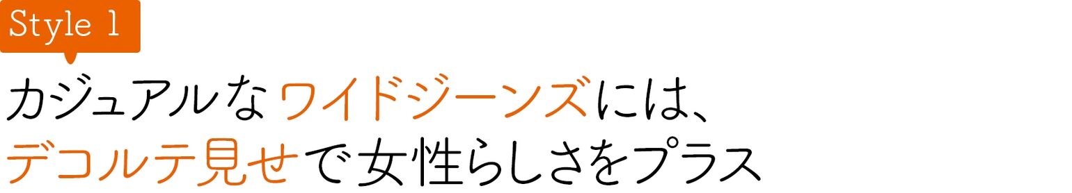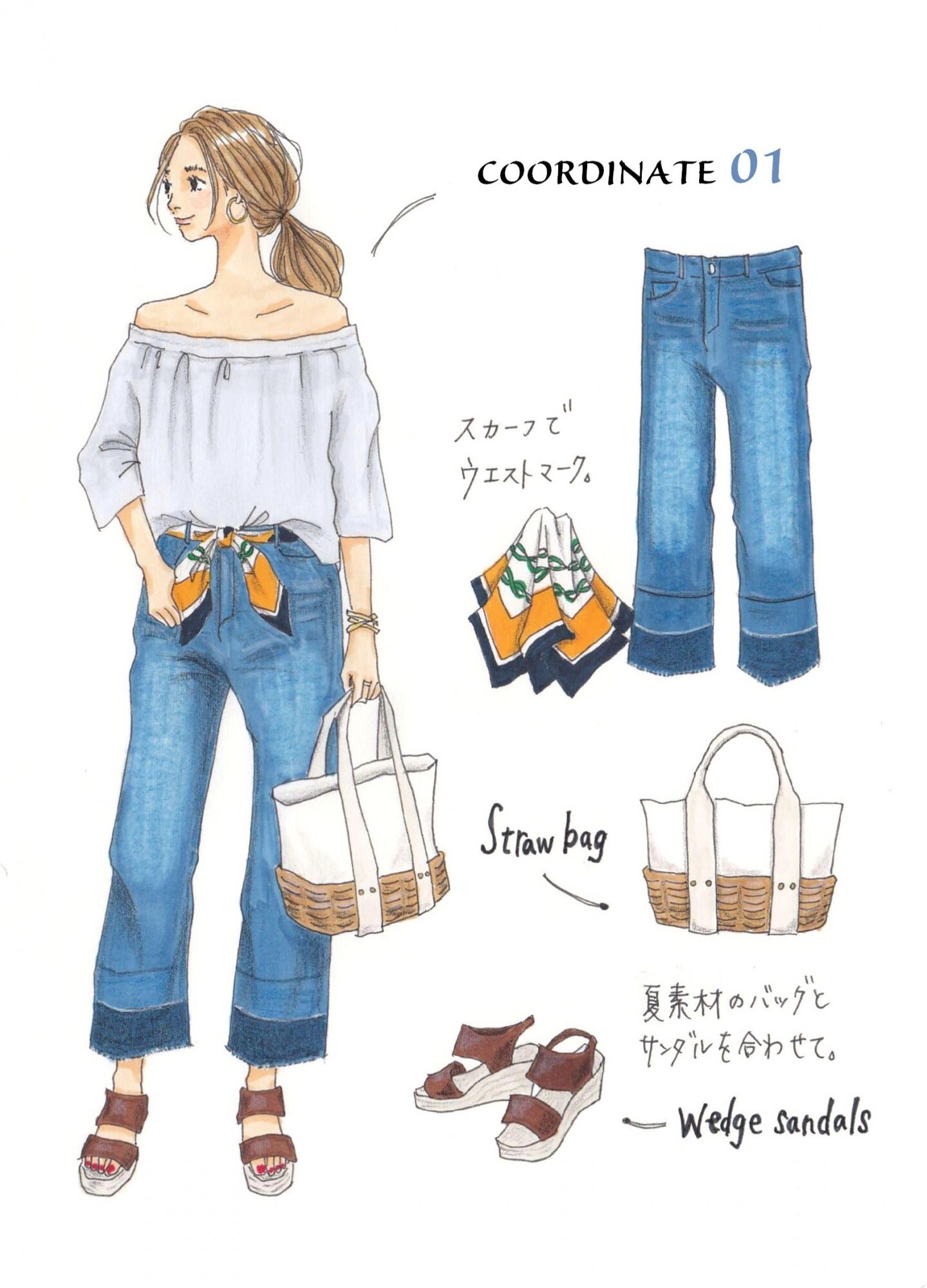 「同じく今季注目のワイドジーンズを合わせた、トレンド感たっぷりなコーデ。カジュアルなデニムと合わせる時には、オフショルダーにして女性らしさをプラスするのがポイントです。ブラウスの裾はウエストインして、腰回りをすっきり見せるのが今の気分。ベルト代わりにアクセントカラーのスカーフをウエストに巻くと、ぐっとおしゃれ度がアップします。カゴトートやジュートサンダルなど、夏らしい小物を組み合わせるのがおすすめ♪」